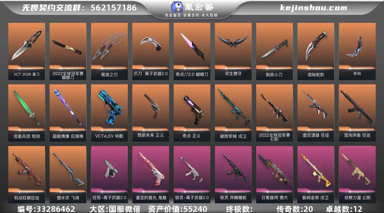 段位: 黄金 亮点皮肤: 幻影-2022全球冠军赛,蝴蝶刀-2022全球冠军赛 套装: 异鳞魔蛇,离子武器2.0,2022全球冠军赛 近战武器皮肤: 剥皮小刀-异形猎人,黑波之刃-塑水宗,军刀-流星军团错误,超能偶像 应援棒,短剑-流星兵团,蝴蝶刀-奇点//2.0,双生獠牙-异鳞魔蛇,离子武器2.0 爪刀,诡秘蛇影,影钩-掠影2.0,VCT 2026 篆刀 步枪皮肤: 戍卫-紫阙金琅,狂徒-盖亚的复仇,幻影-侦察力量,狂徒-机动狂飙,戍卫-破败军械,獠犬-日冕雄师,狂徒-混沌序曲,幻影-异鳞魔蛇,狂徒-虚空遗器,狂徒-离子武器2.0 佩枪皮肤: 正义-奇点,鬼魅-盖亚的复仇,标配-VCTxLEV,正义-西部未来,狂怒-离子武器2.0,蒙太奇 狂怒 狙击枪皮肤: 飞将-塑水宗,冥驹-堕天遗武 冲锋枪皮肤: 骇灵-异鳞魔蛇,骇灵-离子武器2.0 机枪皮肤: 战神-离子武器2.0 亮点: 【优质装备】:正义-奇点,狂徒-混沌序曲,狂徒-盖亚的复仇,幻影-侦察力量,狂徒-机动狂飙,冥驹-堕天遗武,鬼魅-盖亚的复仇,剥皮小刀,戍卫-破败军械,黑波之刃,飞将-塑水宗,蝴蝶刀-奇点//2.0,双生獠牙,离子武器2.0 爪刀,诡秘蛇影,戍卫-紫阙金琅,獠犬-日冕雄师,幻影-2022全球冠军赛,蝴蝶刀-2022全球冠军赛,影钩
