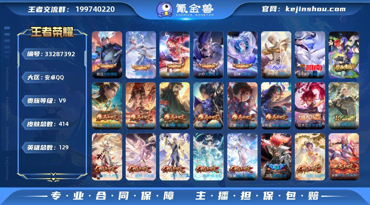 安卓Q-V9-永恒钻石III段位-129英雄-414皮肤-5典藏皮肤-1无双-2珍品传说-38传说-116史诗 【英雄全皮】:刘禅全皮,孙权全皮,敖隐全皮,空空儿全皮,影全皮,海诺全皮 【荣耀典藏】:小乔天鹅之梦,貂蝉幻阙歌,韩信弑枪猎影,瑶拾光映像,伽罗最初的交响 【无双皮肤】:孙悟空无相 【珍品传说】:孙策时之奇旅,马可波罗怪盗基德 【传说皮肤】:云缨神骥越千峰,关羽神骥镇沧海,朵莉亚神骥鸣幻洲,狄仁杰神骥赴朔漠,貂蝉神骥聚万邦,马超神骥逐星野,花木兰异界灵契,后羿神树通天,司空震愿照山河定,女娲愿照千秋盛,妲己愿照众生和,澜愿照九州拓,蔡文姬愿照福禄聚,虞姬愿照岁时盈,嬴政玄雷天君,桑启鸣野蒿,庄周牧神诗旅,貂蝉曦玄引,孙策乘龙淬吴钩,赵云乘龙铭钟鼎,马超琥珀纪元,铠琥珀纪元,澜逐花归海,露娜霜月吟,吕布怒海麟威,赵云淬星耀世,西施游龙清影,铠绛天战甲,镜炽阳神光,虞姬启明星使,曜云鹰飞将,干将莫邪久胜战神,达摩黄金狮子座,后羿黄金射手座,貂蝉仲夏夜之梦,孙尚香末日机甲,宫本武藏地狱之眼,孙悟空地狱火 【限定皮肤】:蔡文姬夏日便利店,大乔绒语心约,虞姬夏日便利店,姜子牙天穹之誓,杨戬破阵退雄兵,李白谪仙醉月,狄仁...