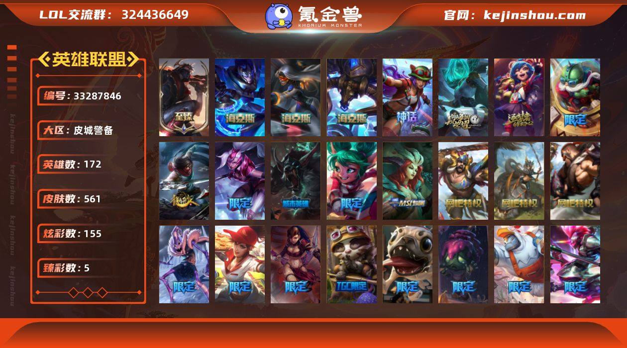 【LOLYH2209】172英雄/561皮肤/7神话/92限定/5臻彩/155炫彩/48传说/143史诗/黄金/10周年 安妮/源代码 乐芙兰/十五周年纪念 希维尔/至臻 西部魔影 泰隆/海克斯 阿利斯塔/海克斯 希维尔/海克斯 嘉文四世/冰霜之刃 艾瑞莉娅 炫金/泳池派对 凯特琳 粉红冰川/红莲之刃 锐雯/灌篮高手 德莱厄斯 金色神话/银龙裁决 泰隆/甜心宝贝 安妮/觅心魔灵 奥利安娜/幽梦玫瑰 泰隆/幸福女神 乐芙兰/圣诞开心鬼 提莫/圣诞精灵 崔丝塔娜/圣诞狂欢 努努/圣诞狂欢 时光/“主人不要我了” 阿木木/胡桃夹子 小丑/平安夜女神 娑娜/邪恶圣诞老人 维迦/冰雪节 茂凯/雪默丁格/圣诞老人 酒桶/圣诞驯鹿 克格莫/寒冬精灵 璐璐/冰雪节 炼金/冰雪节 马尔扎哈/冰雪女神 辛德拉/冰雪兽 纳尔/哥特萝莉 安妮/战熊骑士 瑟庄妮/送披萨的小姐姐 希维尔/S1FNC 酒桶/S1FNC 迦娜/S1FNC 嘉文四世/S1FNC 卡尔萨斯/S1FNC 库奇/S2 暗杀星 蒙多/S2 暗杀星 努努/S2 暗杀星 慎/S2 暗杀星 伊泽瑞尔/S3 SKT T1 婕拉/S3 SKT T1 薇恩/S4 SSW 炼金/S4 SSW 图奇/S4 SSW 泰隆/S4 SSW 雷恩加尔/S4 SSW 锤石/S5 SKT T1 阿利斯塔/S5 SKT T1 阿兹尔/S5 SKT T1 滑板鞋/S5 SKT T1 雷克顿/S5 SKT T1 瑞兹/S5 SKT T1 蜘蛛/4周年 锐雯/玉剑传说无影/...