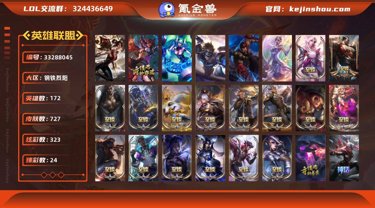 【LOLYH2225】172英雄/727皮肤/5终极/28神话/107限定/24臻彩/323炫彩/81传说/114史诗/流光翡翠/觅心游侠卢锡安/玉剑传说无影/殿堂传奇 卡莎/10周年 安妮/源代码 乐芙兰/十五周年纪念 希维尔/暗星 科加斯/殿堂传奇 薇恩/水晶巫灵 泽拉斯/至臻 魅惑女巫 莫甘娜/至臻蒙面女郎莫甘娜/至臻 西部魔影 伊芙琳/至臻安魂曲娑娜/至臻 源计划:正义 艾瑞莉娅/至臻 狼神英灵 斯维因/至臻 暗裔英雄 嘉文四世/至臻 灵能特工 伊泽瑞尔/至臻 西部魔影 泰隆/至臻 灵魂莲华 拉克丝/至臻 绒毛菲兹/至臻 神龙尊者均衡之龙 沃利贝尔/至臻 凯旋将军 德莱厄斯/至臻 青花瓷 丽桑卓/至臻永恒星灵佐伊/至臻 魔域梦魇 泽丽/至臻 灵魂莲华 劫/至臻 星之守护者 艾克/至臻 神龙尊者 比翼之龙 洛/至臻 源计划:逆流 塞拉斯/至臻 莲华温泉 厄斐琉斯/至臻 至高天 奎桑提/天龙之子 卡莎 飞龙乘云/无畏骑士 瑟庄妮 赤子初心/冠军之箭 艾希 凯旋圣装/墨之影武者 亚索 金墨耀影/偶像歌手 阿狸 极地雪莲/花仙子 拉克丝 纹白/弹幕天使 卡莎 炽天使·勇敢/泳池派对 菲奥娜 清凉苹果冰/星之守护者 金克丝 黑洞/山海绘卷 科加斯 朱红/幻灵战斗兔 锐雯 梦幻强袭/玉剑传说 苍鸾 丁香/灵魂莲华 亚索 霜见之时/可爱可爱粉红红...