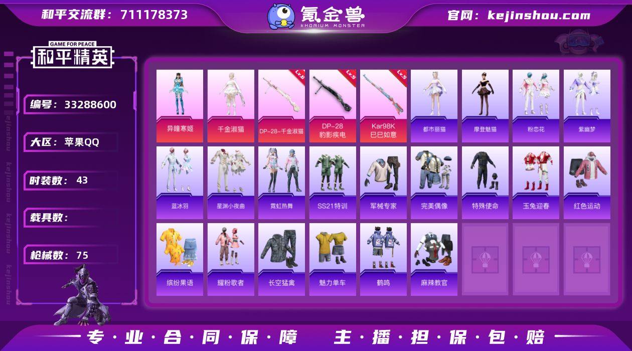 【编号58037 可秒换绑】【店长推荐!极品女号!千金淑猫 小舞人物 幻夜紫晶 极地冰晶 蜜语粉晶 异瞳寒姬!!】 苹果 手Q-6粉装-5特效枪-0载具-2粉色飞行器-21383热力值-2王牌印记-43套装-75枪皮 【粉色套装】:角色-千金淑猫,角色-异瞳寒姬,人物-小舞·雪昙,角色-幻夜紫晶,角色-蜜语粉晶,角色-极地冰晶 【粉色枪皮等级】:UMP45-萌骑冒险(二级),Kar98K-巳巳如意(五级),DP-28-千金淑猫(六级),DP-28-豹影疾电(五级),DP-28-鸢尾珑雾(一级) 【粉色枪皮】:UMP45-萌骑冒险,Kar98K-巳巳如意,DP-28-千金淑猫,DP-28-豹影疾电,DP-28-鸢尾珑雾 【粉色飞行器】:绯果甜心飞行器,幻夜紫晶飞行器 【粉色降落伞】:千金淑猫降落伞,星穹咏叹调降落伞,绯穹魔姬降落伞,异瞳寒姬降落伞,霁蓝缠春降落伞,罪夜之冕降落伞,幻夜紫晶降落伞,鸢尾珑雾降落伞 【稀有套装】:角色-都市丽猫,角色-摩登魅猫,套装-粉恋花,套装-紫幽梦,套装-蓝冰羽,套装-星渊小夜曲,套装-霓虹热舞,套装-雨过天青,套装-红釉青花,角色-枫露凝珀,角色-皓月伶影,套装-裁决之瞳 【稀有枪皮】:AKM-破晓战魂,AKM-龙的传人,M16A4-千金淑猫,SCAR-L-炫彩节奏,SCAR-L-玉兔迎春,SCAR-L-黄金龙骨,...