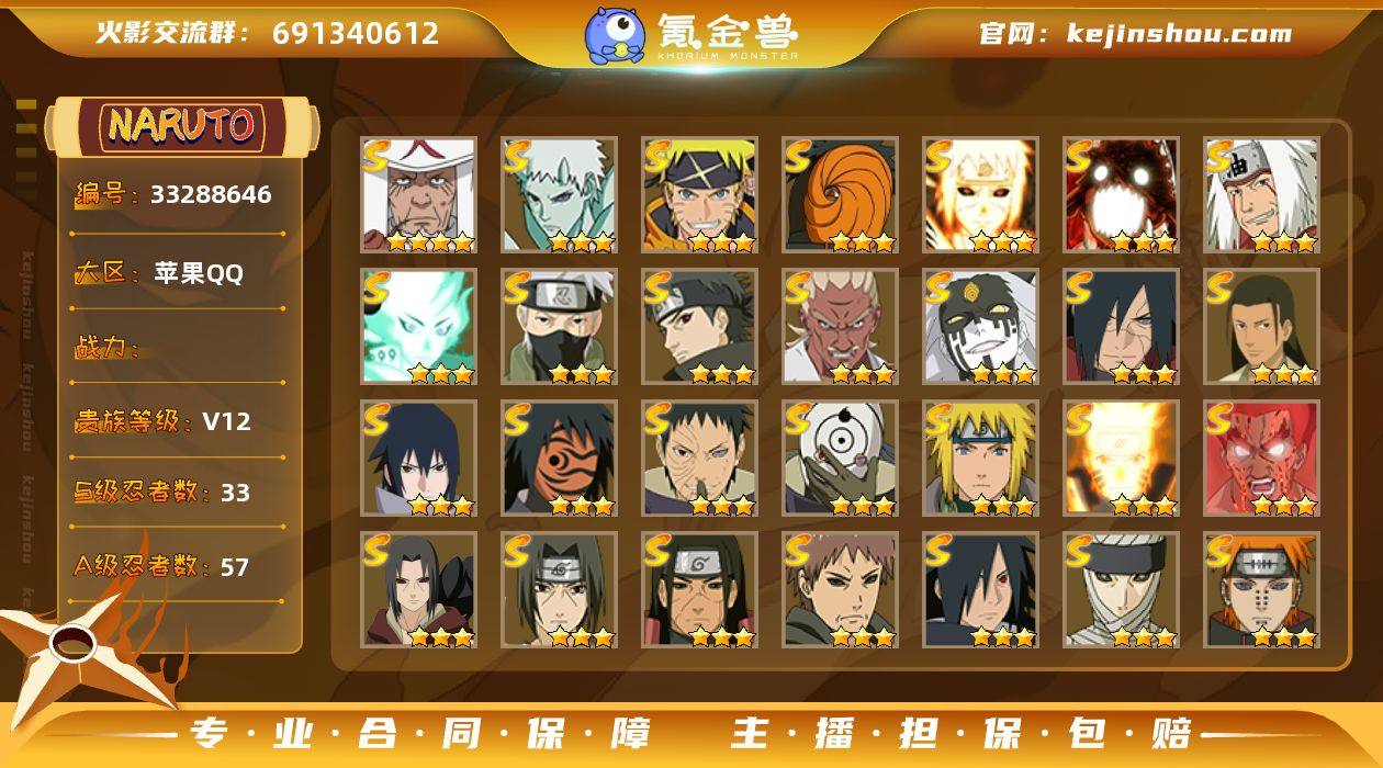V12/S忍33/A忍57/二星A-波风水门「新春限定」/三星S-纲手/三星S-波风水门「九喇嘛连结」/三星S-宇智波带土「十尾人柱力」/二星A-达鲁伊「五代目雷影」/二星A-飞段「死司凭血」/三星S-无「二代目土影」/二星A-宇智波止水/五星A-猿飞阿斯玛/三星S-旗木卡卡西「须佐能乎」/2星小南「神驹佑将」/三星A-蝎/五星A-迈特凯/二星A-宇智波鼬「新春限定」/二星A-奇拉比「忍界大战」/三星S-千手柱间·木叶创立/二星A-神秘面具男 「忍者之路」/2星旗木卡卡西「神威对决」/三星S-罗砂「四代目风影」/三星S-大筒木桃式/二星A-长十郎「六代目水影」/二星A-蝎「绯流琥」/三星S-漩涡鸣人 「暴怒·第六尾」/二星A-桃地再不斩「秽土转生」/二星A-春野樱「百豪」/三星S-宇智波斑「白面具」/三星S-迈特凯「死门」/三星S-自来也 「传说中的三忍」/二星A-飞段「恶灵之影」/二星A-黑土「四代目土影」/二星A-药师兜「半蛇斗篷」/二星A-神农 「羁绊」/三星S-春野樱 「忍界大战」/二星A-宇智波佐助「万花筒写轮眼」/二星A-我爱罗「忍界大战」/二星A-迪达拉/四星A-我爱罗「疾风传」/二星A-小南/二星A-不缘/二星A-猿飞木叶丸「博人传」/二星A-大蛇丸「晓」/二星A-日向宁次·忍界大战/二星A-宇智波带土「漂泊浪客...