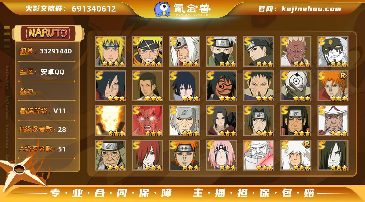 【XY371】VIP等级V11/S忍数量28/A忍数量51/二星A-波风水门「新春限定」/二星A-达鲁伊「五代目雷影」/二星A-飞段「死司凭血」/五星A-猿飞阿斯玛/三星S-旗木卡卡西「须佐能乎」/三星S-猿飞日斩「秽土转生」/五星A-迈特凯/二星A-奇拉比「忍界大战」/三星S-千手扉间「秽土转生」/三星S-千手柱间·木叶创立/二星A-神秘面具男 「忍者之路」/三星S-大筒木桃式/二星A-长十郎「六代目水影」/二星A-蝎「绯流琥」/二星A-桃地再不斩「秽土转生」/三星S-宇智波斑「白面具」/三星S-迈特凯「死门」/三星S-自来也 「传说中的三忍」/三星S-猿飞日斩/二星A-飞段「恶灵之影」/二星A-黑土「四代目土影」/三星S-佩恩·天道「超」/二星A-迪达拉「秽土转生」/二星A-药师兜「半蛇斗篷」/二星A-神农 「羁绊」/三星S-春野樱 「忍界大战」/二星A-宇智波佐助「万花筒写轮眼」/二星A-我爱罗「忍界大战」/二星A-迪达拉/四星A-我爱罗「疾风传」/二星A-不动/二星A-不缘/二星A-大蛇丸「晓」/二星A-日向宁次·忍界大战/二星A-宇智波带土「漂泊浪客」/二星A-宇智波鼬/三星S-宇智波佐助「永恒万花筒」/三星S-大筒木金式「博人传」/三星S-宇智波鼬「秽土转生」/二星A-长门「青年」/三星S-宇智波带土 「忍界大战」/三星A...