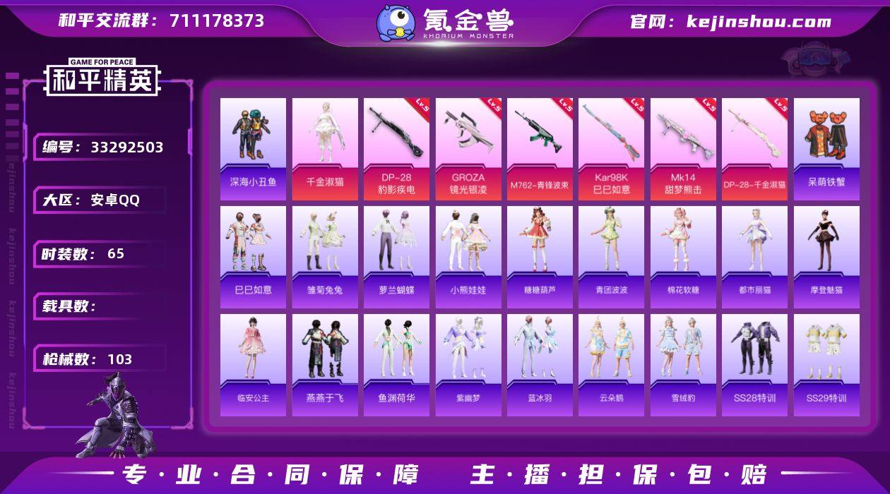 安卓【小号 角色-千金淑猫/Kar98K-巳巳如意(五级)/Mk14-甜梦熊击(五级)/DP-28-千金淑猫(五级)/百万伏特头盔】 手Q-1粉装-6特效枪-0载具-2粉色飞行器-28647热力值-4王牌印记-65套装-103枪皮 【热门品类】:套装-深海小丑鱼 【粉色套装】:角色-千金淑猫 【粉色枪皮等级】:GROZA-镜光银凌(五级),M762-青锋波束(五级),Kar98K-巳巳如意(五级),Mk14-甜梦熊击(五级),DP-28-千金淑猫(五级),DP-28-豹影疾电(五级) 【粉色枪皮】:GROZA-镜光银凌,M762-青锋波束,Kar98K-巳巳如意,Mk14-甜梦熊击,DP-28-千金淑猫,DP-28-豹影疾电 【粉色飞行器】:炫彩糖果飞行器,祥瑞起舞飞行器 【粉色降落伞】:创世·救赎降落伞,千金淑猫降落伞,临安公主降落伞,幻彩电音降落伞,炫彩糖果降落伞 【稀有套装】:套装-巳巳如意,套装-炫彩糖果,套装-雏菊兔兔,套装-萝兰蝴蝶,套装-小熊娃娃,套装-糖糖葫芦,套装-青团波波,套装-棉花软糖,角色-都市丽猫,角色-摩登魅猫,角色-临安公主,套装-燕燕于飞,套装-鱼渊荷华,套装-紫幽梦,套装-蓝冰羽,套装-云朵鹅,套装-雪绒豹 【稀有枪皮】:AKM-破晓战魂,AKM-虎虎生威,AKM-龙的传人,M16A4-千金淑猫,SCAR-L-炫彩节奏,M416-红色方程式,M...