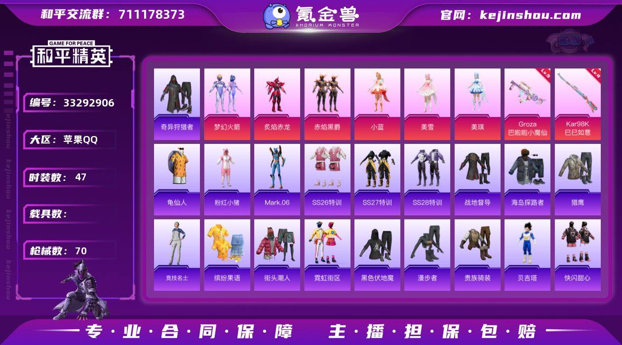 【AZH3599】苹果 手Q【梦幻火箭小蓝美琪美雪 巴啦啦小魔仙GROZA】6粉装-3特效枪-0载具-3粉色飞行器-20457热力值-1王牌印记-47套装-70枪皮 【热门品类】:粉装-梦幻火箭,套装-奇异狩猎者,套装-龟仙人,套装-粉红小猪,角色-Mark.06 【粉色套装】:粉装-梦幻火箭,粉装-炙焰赤龙,粉装-赤焰黑爵,角色-小蓝,角色-美雪,角色-美琪 【粉色枪皮等级】:GROZA-巴啦啦小魔仙(五级),Kar98K-巳巳如意(四级),Mk14-福马献瑞(二级) 【粉色枪皮】:GROZA-巴啦啦小魔仙,Kar98K-巳巳如意,Mk14-福马献瑞 【粉色飞行器】:齐天大圣飞行器,镜域双华-灵镜之阶,龙翔九天飞行器 【粉色降落伞】:梦幻火箭降落伞,冷魅冰骑降落伞,龙珠超降落伞,猪猪侠降落伞,江南烟雨降落伞,巴啦啦小魔仙降落伞,精灵梦叶罗丽降落伞 【稀有套装】:套装-龟仙人,套装-雨过天青,套装-红釉青花 【稀有枪皮】:AKM-江南烟雨,AKM-霓虹街区,M416-红色方程式,AUG-天降萌叽,AUG-耀粉歌者,G36C-冷魅冰骑,AC-VAL-快闪甜心,蜜獾-天降萌叽,Famas-墨龙九天,UZI-啾咪啾咪,UZI-天降萌叽,UZI-影袭,UMP45-猪猪侠,Vector-焰鹰斗篷,汤姆逊-耀粉歌者,P90-快闪甜心,Kar98K-彩虹符号,Kar98K-梦幻火箭,AWM-...