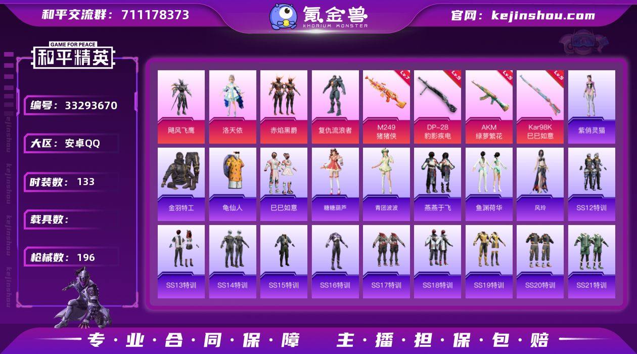 安卓【小号/洛天依/5粉装-5特效枪-1粉色飞行器】 手Q--59295热力值-8王牌印记-133套装-196枪皮 【热门品类】:套装-金羽特工,套装-龟仙人 【粉色套装】:粉装-飓风飞鹰,角色-洛天依,粉装-赤焰黑爵,角色-复仇流浪者,角色-虹云熊熊 【粉色枪皮等级】:AKM-绿萝繁花(五级),Kar98K-巳巳如意(五级),Mk14-福马献瑞(四级),M249-猪猪侠(七级),DP-28-豹影疾电(五级) 【粉色枪皮】:AKM-绿萝繁花,Kar98K-巳巳如意,Mk14-福马献瑞,M249-猪猪侠,DP-28-豹影疾电 【粉色飞行器】:齐天大圣飞行器 【粉色降落伞】:潮汐统领降落伞,葫芦兄弟降落伞,洛神天依降落伞,筑梦精灵降落伞,精灵梦叶罗丽降落伞,临安公主降落伞,冷漠罗丽降落伞,异瞳寒姬降落伞 【稀有套装】:套装-龟仙人,套装-巳巳如意,角色-罗莉,套装-迅捷龙虾,套装-糖糖葫芦,套装-青团波波,套装-燕燕于飞,套装-鱼渊荷华,角色-风玲,角色-紫俏灵猫,套装-雨过天青,套装-红釉青花,角色-暖阳柴柴 【稀有枪皮】:AKM-夜灯,AKM-彩虹符号,AKM-环太平洋,AKM-破晓战魂,AKM-萌趣颜团子,AKM-虎虎生威,AKM-阿狸红,AKM-霓虹街区,M16A4-幻世战舞者,M16A4-甜心亚梦,SCAR-L-炫彩节奏,SCAR-L-玉兔迎春,SCAR-L...