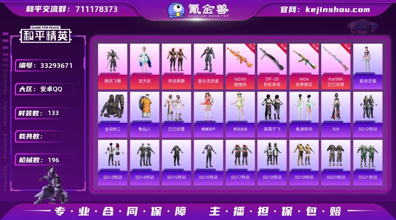 安卓【小号/洛天依/5粉装-5特效枪-1粉色飞行器】 手Q--59295热力值-8王牌印记-133套装-196枪皮 【热门品类】:套装-金羽特工,套装-龟仙人 【粉色套装】:粉装-飓风飞鹰,角色-洛天依,粉装-赤焰黑爵,角色-复仇流浪者,角色-虹云熊熊 【粉色枪皮等级】:AKM-绿萝繁花(五级),Kar98K-巳巳如意(五级),Mk14-福马献瑞(四级),M249-猪猪侠(七级),DP-28-豹影疾电(五级) 【粉色枪皮】:AKM-绿萝繁花,Kar98K-巳巳如意,Mk14-福马献瑞,M249-猪猪侠,DP-28-豹影疾电 【粉色飞行器】:齐天大圣飞行器 【粉色降落伞】:潮汐统领降落伞,葫芦兄弟降落伞,洛神天依降落伞,筑梦精灵降落伞,精灵梦叶罗丽降落伞,临安公主降落伞,冷漠罗丽降落伞,异瞳寒姬降落伞 【稀有套装】:套装-龟仙人,套装-巳巳如意,角色-罗莉,套装-迅捷龙虾,套装-糖糖葫芦,套装-青团波波,套装-燕燕于飞,套装-鱼渊荷华,角色-风玲,角色-紫俏灵猫,套装-雨过天青,套装-红釉青花,角色-暖阳柴柴 【稀有枪皮】:AKM-夜灯,AKM-彩虹符号,AKM-环太平洋,AKM-破晓战魂,AKM-萌趣颜团子,AKM-虎虎生威,AKM-阿狸红,AKM-霓虹街区,M16A4-幻世战舞者,M16A4-甜心亚梦,SCAR-L-炫彩节奏,SCAR-L-玉兔迎春,SCAR-L...