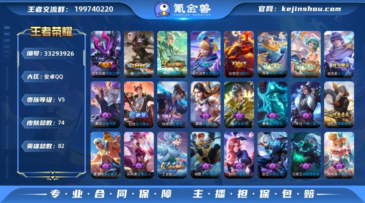 安卓Q-V5-永恒钻石IV段位-82英雄-74皮肤-5传说-23史诗【传说皮肤】:桑启鸣野蒿,马可波罗妄想实况,曜云鹰飞将,宫本武藏地狱之眼,孙悟空地狱火【限定皮肤】:狄仁杰阴阳师,赵云皇家上将,孙尚香蔷薇恋人,马可波罗妄想实况,项羽海滩派对,孙悟空至尊宝,上官婉儿梁祝,鲁班大师探海日志,张良古海寻踪【赛季限定】:鲁班大师探海日志,张良古海寻踪,钟馗虚灵犬护,甄姬逆浪荇歌,亚瑟荣光之誓【战令限定】:莱西奥光弋星穹,明世隐往忆晖光,周瑜线条小狗,小乔线条小狗【史诗皮肤】:海月海之女神,周瑜线条小狗,小乔线条小狗,莱西奥光弋星穹,黄忠百相守梦,狂铁龙之律动,澜赏金猎手,杨戬天秀启明,百里玄策热力回旋,上官婉儿梁祝,狄仁杰鹰眼统帅,阿轲节奏热浪,程咬金功夫厨神,兰陵王暗隐猎兽者,夏侯惇乘风破浪,孙悟空至尊宝,李白千年之狐,曹操幽灵船长,嬴政摇滚巨星,孙尚香水果甜心,孙尚香蔷薇恋人,宫本武藏鬼剑武藏,赵云未来纪元,赵云皇家上将,露娜紫霞仙子【其他皮肤】:鲁班七号班班快跑,虞姬溯影追猎,艾琳鹤鸣心笺,明世隐往忆晖光,亚瑟荣光之誓,哪吒罗小黑战记,鬼谷子克喵,莱西奥踏浪烽翎,甄姬逆浪荇歌,阿古朵布丁狗之约,钟馗虚灵...