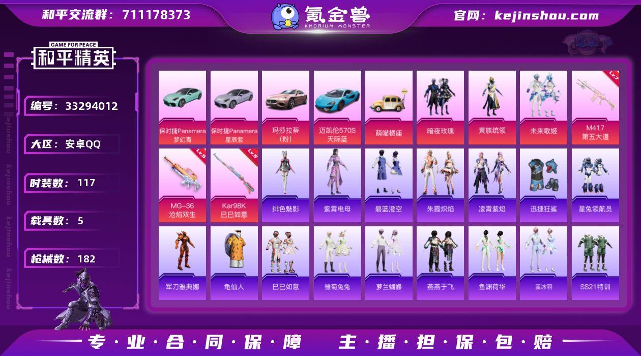 5车安卓 手Q-5粉装-5特效枪-5载具-4粉色飞行器-56886热力值-1王牌印记-117套装-182枪皮 【热门品类】:角色-军刀雅典娜,套装-龟仙人 【粉色套装】:粉装-暗夜玫瑰,粉装-碧蓝澄空,粉装-黄族统领,粉装-未来歌姬,角色-六号石头人 【粉色枪皮等级】:UMP45-萌骑冒险(五级),Kar98K-巳巳如意(五级),Mk14-福马献瑞(一级),M417-第五大道(七级),MG-36-沧焰双生(五级) 【粉色载具】:玛莎拉蒂Ghibli(粉),迈凯伦570S(天际蓝),保时捷Panamera(梦幻青),保时捷Panamera(星辰紫),萌喵橘座 【粉色枪皮】:UMP45-萌骑冒险,Kar98K-巳巳如意,Mk14-福马献瑞,M417-第五大道,MG-36-沧焰双生 【粉色飞行器】:凤舞九天飞行器,戏水时光飞行器,六号石头人降落伞 【粉色降落伞】:环太平洋降落伞,垂柳戏鸭降落伞,太空嘟嘟降落伞,彩虹甜喵降落伞,暗夜鎏金降落伞,第五大道降落伞,炎氏战神降落伞,金丰海韵降落伞,BEARBRICK降落伞,盛世惊鸿降落伞,晶梦幻蝶降落伞,圣域龙灵降落伞,智耀战神降落伞,异瞳寒姬降落伞,六号石头人飞行器 【稀有套装】:套装-龟仙人,套装-巳巳如意,套装-雪国风尚,套装-马上有钱,套装-迅捷龙虾,套装-雏菊兔兔,套装-萝兰蝴蝶,套装-燕...