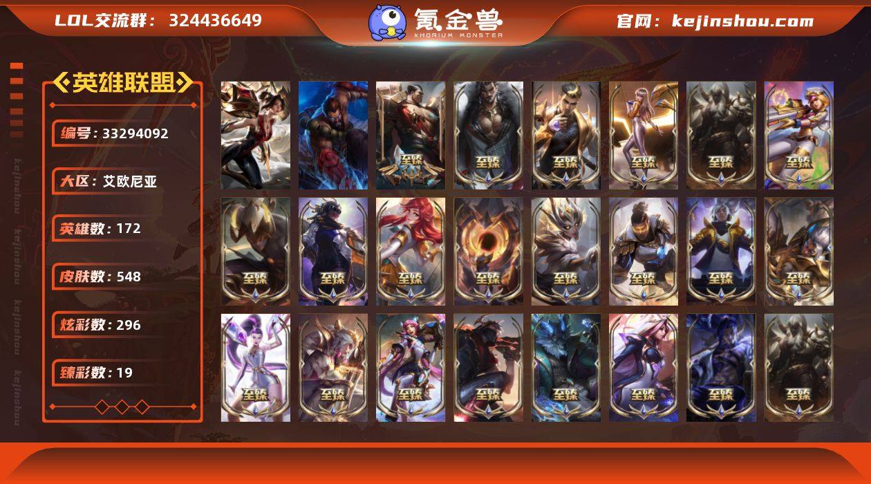 【955611】未定级段位-172英雄-548皮肤-296炫彩-1终极-42神话-66限定-53传说-104史诗 【热门头像】:爱情之歌头像 【卓越皮肤】:殿堂传奇卡莎 【神话皮肤】:十周年纪念安妮,殿堂传奇乐芙兰,十五周年纪念希维尔,神凰行者瑞羽圣凰艾尼维亚,殿堂传奇薇恩,水晶巫灵泽拉斯,灰烬骑士派克 【至臻皮肤】:至臻北极星使者沃里克,至臻绝息圣堂厄运小姐,至臻蒙面女郎莫甘娜,至臻狼神英灵斯维因,至臻电玩女神凯特琳,至臻暗星墨菲特,至臻暗裔英雄嘉文四世,至臻黑夜使者李青,至臻黑夜使者李青(2022),至臻西部魔影猎天使恶魔泰隆,至臻战斗学院拉克丝,至臻凯旋将军德莱厄斯,至臻T1杰斯,至臻女帝黛安娜,至臻永恒星灵佐伊,至臻魔女婕拉,至臻KDA卡莎,至臻KDAALLOUT卡莎,至臻真实伤害亚索,至臻墨之影武者亚索,至臻幻灵战斗猫金克丝,至臻真实伤害赛娜,至臻未来战士卢锡安,至臻灵魂莲华劫,至臻腥红之月亚托克斯,至臻腥红之月亚托克斯(2022),至臻DRX亚托克斯,至臻斗魂觉醒派克,至臻心之钢永恩,至臻北极星神梅尔,至臻神龙尊者炎龙瑟提 【海克斯皮肤】:海克斯科技安妮,海克斯科技卡萨丁,海克斯科技雷克顿,海克斯科技嘉文四世 【臻彩皮肤】:天龙之子卡莎飞龙...