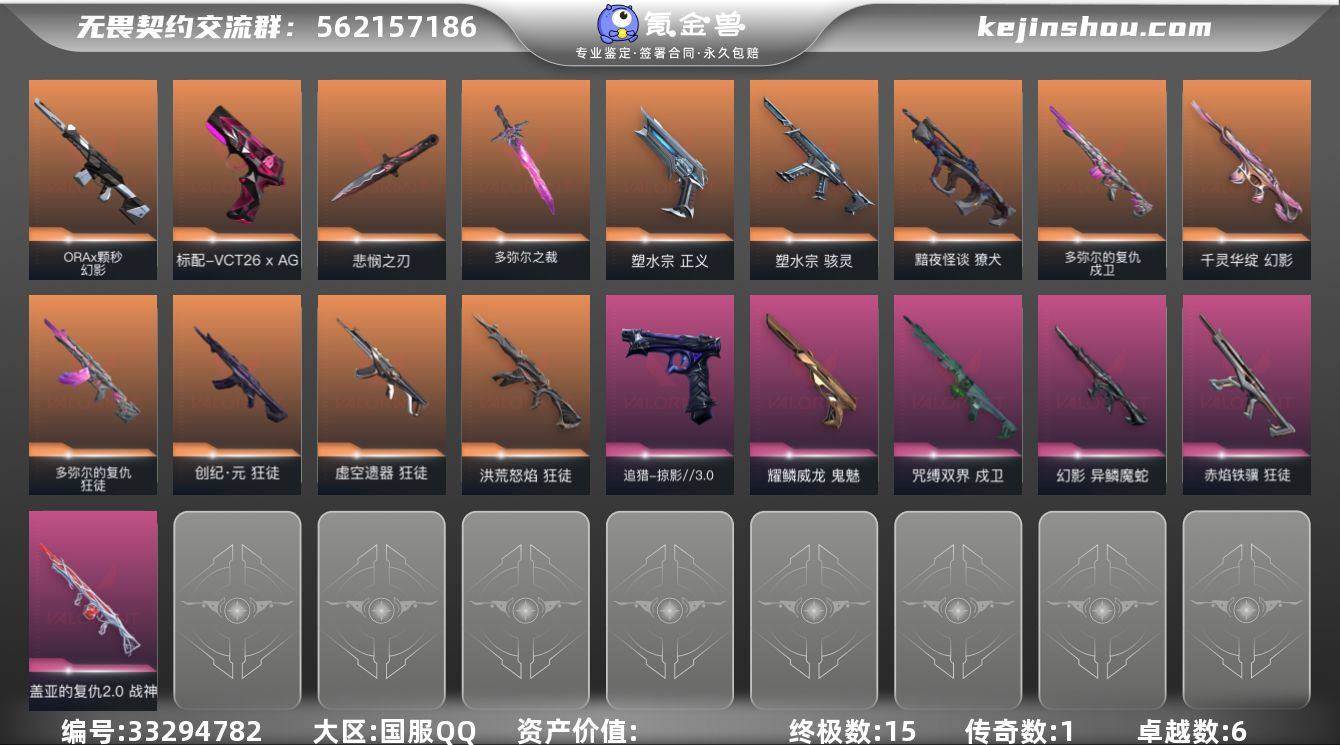 【qyz9821】包人脸 玩够能回血 3刀 5狂徒 qyz9821 【近战武器】:近战武器-无畏契约季前邀请赛 悲悯之刃,近战武器-多弥尔之裁,近战武器-穿花蝴蝶 【狂徒】:狂徒-洪荒怒焰,狂徒-创·纪元,狂徒-虚空遗器,狂徒-多弥尔的复仇,狂徒-赤焰铁骥 【幻影】:幻影-千灵华绽,幻影-ORA x 颗秒,幻影-异鳞魔蛇 【戍卫】:戍卫-多弥尔的复仇,戍卫-咒缚双界 【獠犬】:獠犬-黯夜怪谈 【战神】:战神-盖亚的复仇//2.0 【骇灵】:骇灵-塑水宗 【追猎】:追猎-掠影//3.0 【VCT手枪】:标配-VCT26 x AG 【正义】:正义-塑水宗 【鬼魅】:鬼魅-耀鳞威龙 【卡面】:代号红色 卡面,新兵报到 卡面,V契约 卡面,无畏契约 卡面 【喷漆】:胜利属于无畏契约 喷漆,GLHF 喷漆,无畏契约 喷漆 【挂饰】:无畏契约 纪念币 挂饰