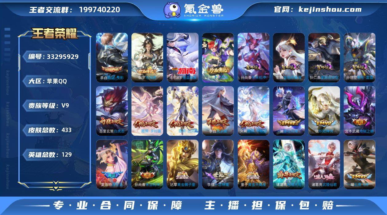小国阿轲【特价急出/详情看图】苹果Q-V9-最强王者段位-129英雄-433皮肤-1典藏皮肤-3珍品传说-4星元-35传说-137史诗 【英雄全皮】:嬴政全皮,刘邦全皮,孙权全皮,苍全皮,鬼谷子全皮,狂铁全皮,猪八戒全皮,敖隐全皮,司空震全皮,空空儿全皮,影全皮 【荣耀典藏】:李白鸣剑曳影 【珍品传说】:伽罗沧流箭,孙策时之奇旅,马可波罗怪盗基德 【传说皮肤】:司空震愿照山河定,女娲愿照千秋盛,虞姬愿照岁时盈,云缨幻光神枪,嬴政玄雷天君,桑启鸣野蒿,墨子黄金天蝎座,澜逐花归海,上官婉儿妄想奇谈,马可波罗妄想实况,公孙离记忆之芯,夏洛特浮生妄,干将莫邪画中仙,吕布怒海麟威,不知火舞绯月行,王昭君乞巧织情,西施游龙清影,诸葛亮时雨天司,铠绛天战甲,镜炽阳神光,虞姬启明星使,孙悟空零号赤焰,曜云鹰飞将,李信一念神魔,张良黄金白羊座,干将莫邪久胜战神,达摩黄金狮子座,百里玄策白虎志,梦奇胖达荣荣,诸葛亮武陵仙君,貂蝉仲夏夜之梦,李白凤求凰,孙尚香末日机甲,宫本武藏地狱之眼,狄仁杰超时空战士 【限定皮肤】:姜子牙天穹之誓,李白谪仙醉月,狄仁杰阴阳师,赵云皇家上将,赵云引擎之心,赵云龙胆,墨子神迹守卫,妲己时之彼端,嬴政优雅恋人...