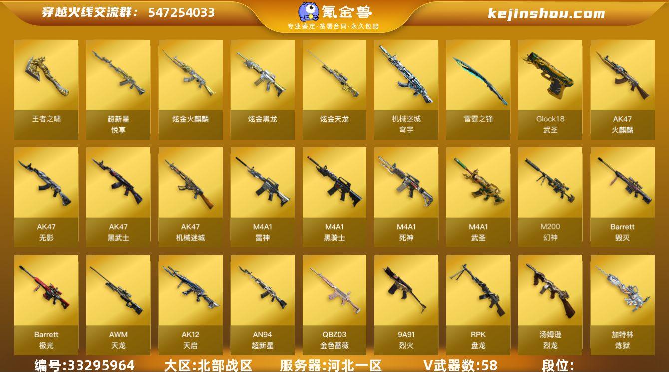 北部战区(河北一区)ys【爆破生化号】58v【M200-幻神+皮/黄忠,武圣套装,QBZ03-金色蔷薇,Barrett-毁灭,5烈龙+死亡之眼+双面神,】4王者【王者之啸,超新星-悦享,盘龙-悦心】3炫金【炫金黑龙,炫金天龙,炫金火麒麟】4角色【葵,零,狐影,王者-零】3皮肤【幻神-黄忠,毁灭-英雄计划】vip3 截图展示段位不代表实际段位 如赛季更新等不可抗拒因素发生变化、时限道具不保证所剩时间