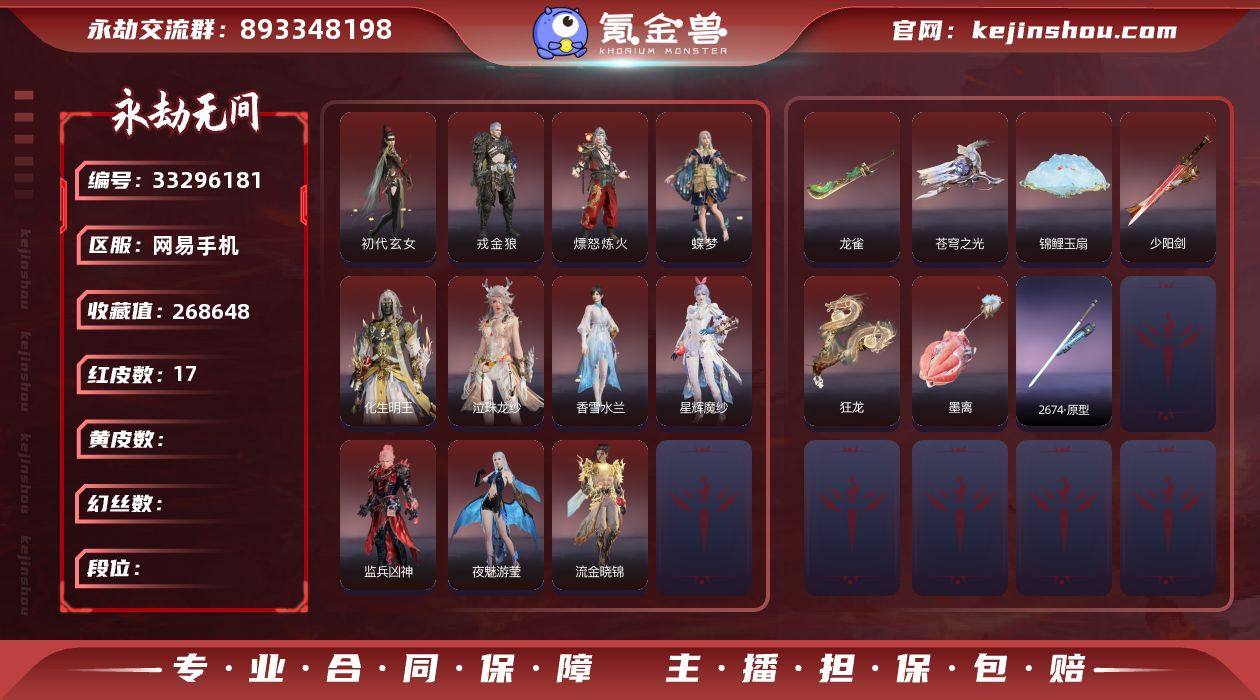 YJJ2268/5.7换绑/等级225/s20三人白银1/18红346金收藏值268648/初代玄女/墨离/星辉魔纱/化生明王/戎金狼/熛怒炼火/蝶梦/阴阳师/泣珠龙纱/香雪水兰/监兵凶神/夜魅游莹/流金晓锦/苍穹之光/少阳剑/龙雀/锦鲤玉扇/狂龙/2674·原型/绿野守护·竹韵悠/2674·初代机/珥冰/御翔云/金人俑/荆魂/千秋匠心·凶虎/龙之道·灵心/幻丝36030/已绑定手游