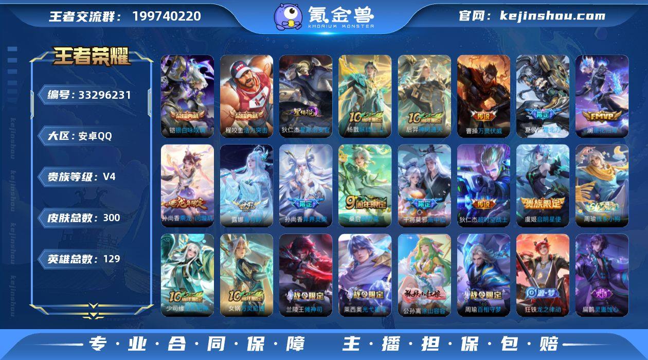 【特价出售/店主推荐/不包人脸】安卓Q-V4-最强王者段位-128英雄-300皮肤-2典藏皮肤-1星传说-12传说-82史诗-1小兵 【英雄全皮】:孙权全皮,狂铁全皮 【荣耀典藏】:程咬金活力突击,铠银白咏叹调 【传说皮肤】:杨戬纵目迁山,后羿神树通天,曹操万灵伏威,桑启鸣野蒿,夏侯惇霜北刀,孙尚香乘龙问璇玑,澜逐花归海,露娜霜月吟,干将莫邪画中仙,孙尚香异界灵契,虞姬启明星使,狄仁杰超时空战士 【限定皮肤】:白起狰,夏侯惇霜北刀,姜子牙天穹之誓,狄仁杰阴阳师,赵云皇家上将,墨子神迹守卫,嬴政优雅恋人,孙尚香异界灵契,鲁班七号狮舞东方,庄周高山流水,高渐离玩趣恶龙,阿轲迷踪丽影,钟无艳超时空战士,扁鹊奇幻香踪,白起夜都怪侠,芈月重明,芈月幻夜卜梦,吕布猎兽之王,周瑜赤莲之焰,元歌云间偶戏,夏侯惇朔风刀,甄姬游园惊梦,甄姬落雪兰心,曹操烛龙,典韦穷奇,典韦蓝屏警告,马可波罗暗影游猎,狄仁杰魔术师,狄仁杰万华元夜,达摩星际陆战队,达摩沙漠行僧,项羽海滩派对,老夫子醍醐杖,老夫子航海奇遇记,程咬金演武夺筹,刘邦夺宝奇兵,王昭君午后时光,兰陵王金庭之子,亚瑟潮玩骑士王,牛魔御旌,后羿圣弓游侠,李元芳银河之约,李元芳云中旅人...