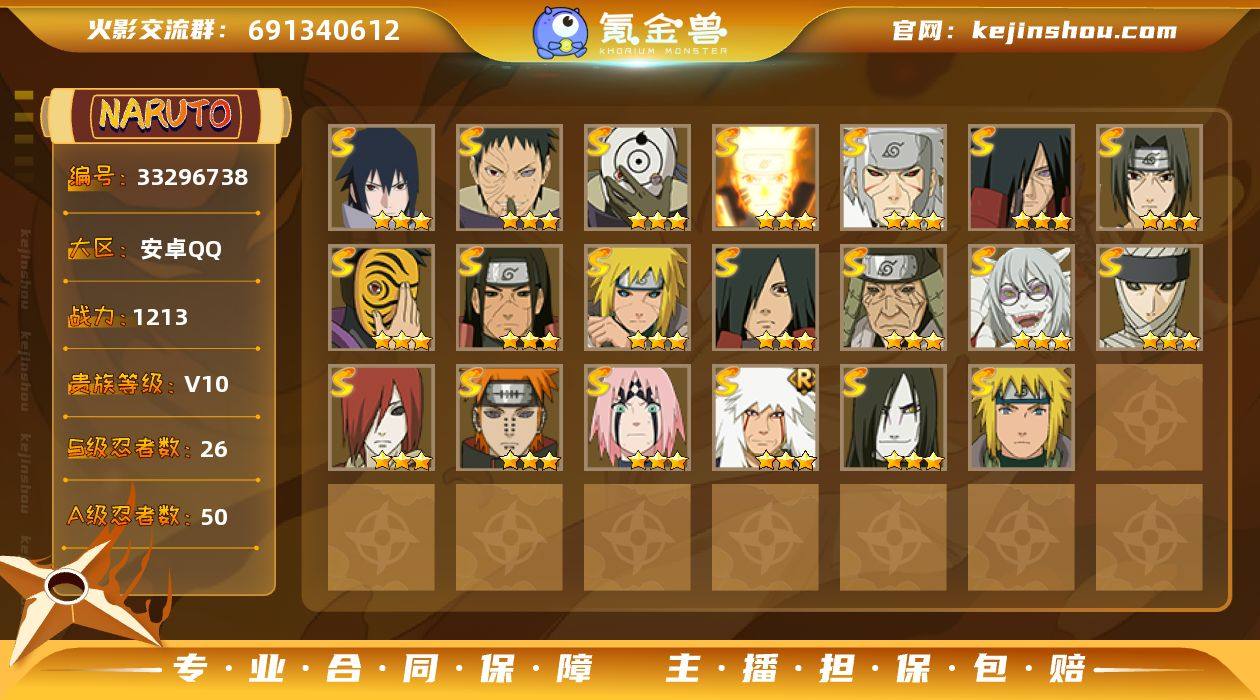 V10 26S忍 50A忍 21通灵 1213.9W战力 可二次 可修改实名 【S级忍者】宇智波斑「秽土转生·解」,宇智波佐助「永恒万花筒」,神秘面具男 「红夜之刃」,春野樱 「忍界大战」,大筒木金式「博人传」,漩涡鸣人 「九喇嘛连结」,宇智波带土 「忍界大战」,千手柱间「秽土转生」,自来也 「舞之豪杰」,旗木卡卡西「须佐能乎」,自来也 「传说中的三忍」,漩涡鸣人·宇智波佐助,宇智波带土「十尾人柱力」,宇智波斑「神驹佑将」,药师兜「仙人模式」,宇智波斑「白面具」,千手扉间「秽土转生」,波风水门「秽土转生」,无「二代目土影」,猿飞日斩「秽土转生」,长门「秽土转生」,宇智波斑,宇智波鼬 「须佐能乎」,佩恩「天道」,波风水门,大蛇丸 【通灵兽】熊猫