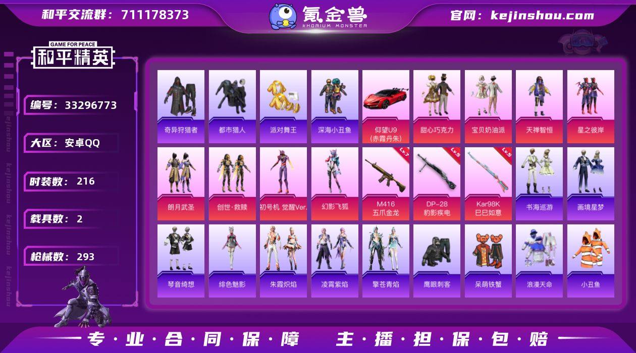 安卓 【精品素材号 粉装-甜心巧克力/粉装-宝贝奶油派/套装-都市猎人/套装-派对舞王/套装-暗影哥特/角色-8号机/M416-五爪金龙(七级)/AKS-74U-森灵之息(五级)/Kar98K-巳巳如意(五级)/仰望U9(赤霞丹朱)/纱华曳影/甜心宝贝背包/百万伏特背包】手Q-9粉装-6特效枪-2载具-5粉色飞行器-92625热力值-18王牌印记-216套装-293枪皮 【热门品类】:套装-浪漫天命,套装-都市猎人,套装-派对舞王,套装-深海小丑鱼,套装-小丑鱼,套装-奇异狩猎者,套装-金羽特工,套装-龟仙人,套装-暗影哥特,角色-8号机 【粉色套装】:粉装-甜心巧克力,粉装-宝贝奶油派,粉装-天禅智恒,粉装-星之彼岸,粉装-朗月武圣,套装-创世·救赎,角色-初号机 觉醒Ver.,粉装-幻影飞狐,角色-鸢尾珑雾 【粉色枪皮等级】:M416-五爪金龙(七级),AKS-74U-森灵之息(五级),Kar98K-巳巳如意(五级),Mk14-福马献瑞(五级),DP-28-豹影疾电(五级) 【粉色载具】:仰望U9(赤霞丹朱),纱华曳影 【粉色枪皮】:M416-五爪金龙,ACE32-百变纱华,AKS-74U-森灵之息,Kar98K-巳巳如意,Mk14-福马献瑞,DP-28-豹影疾电 【粉色飞行器】:炫彩糖果飞行器,星夜魔法师飞行翼,暖熊萌萌飞行器,深渊漩涡飞行器,纱华羽翼飞行器 【...