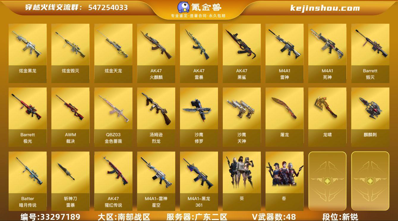 广东二区-50V-0王者武器数-4炫金武器数 【热门武器】:QBZ03-金色蔷薇,汤姆逊-烈龙*6,斯泰尔-蝴蝶,USP-雷暴,沙鹰-修罗 【王者炫金武器】:炫金黑龙,炫金毁灭*2,炫金天龙 【音效卡】:M4A1-黑骑士音效卡,Barrett-毁灭音效卡 【皮肤】:雷神-星空,M4A1-黑龙-361 【角色】:葵,春,风暴女,零-水下丽影,灵狐者-黄金海岸,影武者-X 【人偶武器】:斯泰尔-蝴蝶,COP-旗袍 【挑战大师】:神圣爆裂者III,激光毁灭者III,神圣爆裂者-末日III 【英雄级武器】:AK47-火麒麟,M4A1-雷神,M4A1-死神,AK47-黑鲨,AK47-雷暴,QBZ03-金色蔷薇,AK-47-猩红传说,Barrett-毁灭*2,Barrett-极光,AWM-裁决,Barrett-金色蔷薇,Barrett-暗月传说,汤姆逊-烈龙*6,沙鹰-修罗,沙鹰-天神,USP-雷暴,屠龙,龙啸,麒麟刺*2,斩神刀-雷暴,高爆手雷-雷暴*7,闪光弹-雷暴*7,烟雾弹-雷暴*7 【其他武器】:源·火麒麟,御·火麒麟-平天大圣,源·雷神,魂·雷神-新春神龙,源·天启,魂·QBZ03-金色蔷薇-萌杀,御·炼狱-女娲,魂·屠龙-春桃 【道具】:战舰背包,炫彩背包,妩媚妖姬,夺命之镰,防化服,金色流光-枪王排位,星辰流光-枪王排位,枪王排位28赛季金色流光,C4-沙漠,防弹头盔,防弹衣...