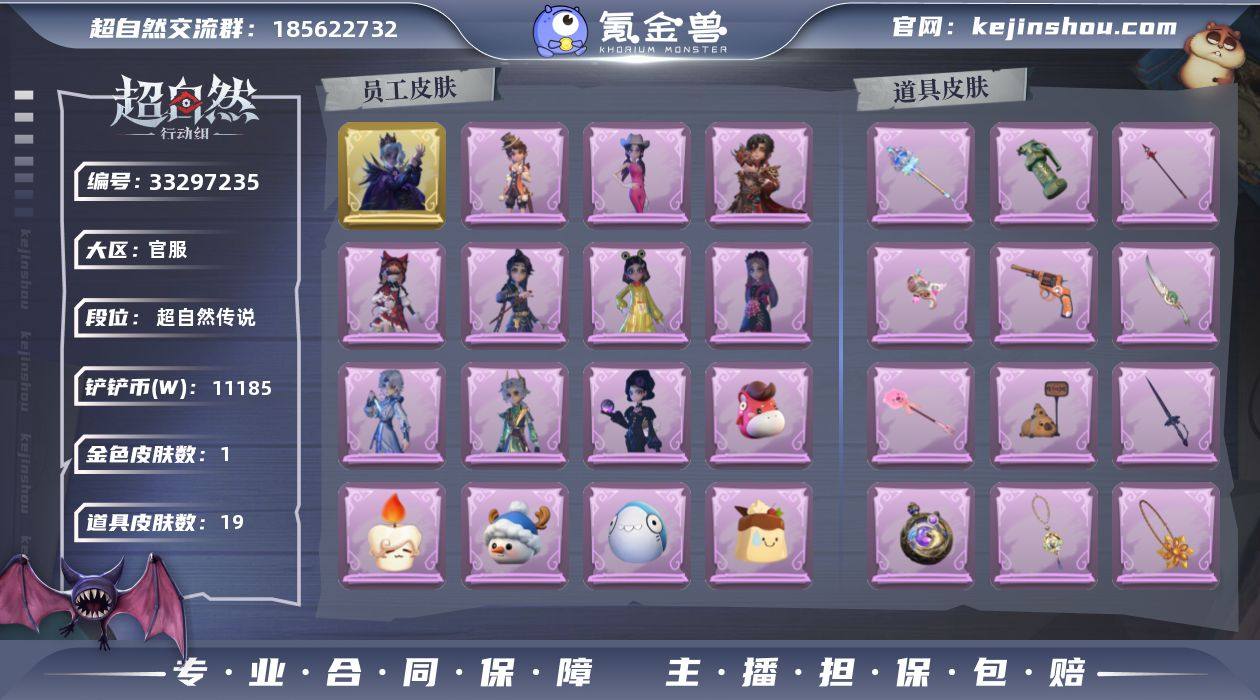 金皮1;紫皮10;道具皮19;皮肤:零-渡鸦公爵,逍遥-泽引山海,逍遥-绣春逍影,爱丽丝-耀眼的你,零-青云逸歌,莉莉-莓果陷阱,零-搬开山,爱丽丝-丝缕哀歌,小黄-呱呱雨衣,阿念-庆宴绮愿,薇薇安-黑月挽歌;道具:腰包-宝剑八,喷气背包-乘风溯雪,音响-鸣沙鼓,刺刀-碧络琅环,短管猎枪-赞萌露比水枪,转轮手枪-新星时代,摸金符-紫霄,腰包-惊魂娃娃,急救包-蔷薇物语,闪光弹-金戈玄铜,传送按钮-逆时审判,长枪-罪棘,电击枪-甜蜜泡泡枪,铲子-赞萌波板糖,桃木剑-永眠曲,摸金符-花落精绝,铲子-卡皮巴拉小黄豚铲,电击枪-权杖的许诺,伞-伞;饰品:头饰-面具马头套,头饰-烈焰红唇头套,头饰-雪墩墩头套,头饰-萨卡班甲鱼头套,头饰-太空鲨头套,头饰-樱桃奶油布丁,头饰-鱼头怪头套,头饰-小狗蛇点点头套,头饰-马上有钱,头饰-驼半仙头套,头饰-卑微头套,头饰-蒜了八,头饰-嘻嘻头套,头饰-烛光纪念,头饰-炙热烧烤,头饰-咬咬鲨头套,头饰-惊魂南瓜头套,头饰-哈士奇头套,头饰-呆滞头套,头饰-滑稽头套,头饰-大葱明头套,头饰-火爆了头套,头饰-哞哞牛头套,头饰-粽小宝头套,头饰-像素朋克墨镜,头饰-后室幸存者头套,挂饰-未竟乐园,挂饰-钗头凤,挂饰-小鲨包包,挂饰-天使消失的年代,挂饰-糖果守卫,背饰-牛啤背包;动作...