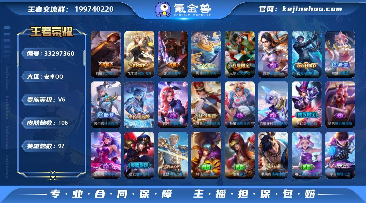 【精品打野号·绝版美猴王·绛天战甲·时之恋人·冠军飞将·街头霸王·紫霞仙子+满级铭文】 安卓Q-V6-尊贵铂金IV段位-97英雄-106皮肤-3传说-14史诗 【传说皮肤】:铠绛天战甲,刘备时之恋人,花木兰冠军飞将 【限定皮肤】:狄仁杰阴阳师,赵云皇家上将,墨子神迹守卫,元歌云间偶戏,狄仁杰魔术师,狄仁杰万华元夜,达摩星际陆战队,达摩沙漠行僧,项羽海滩派对,程咬金演武夺筹,兰陵王金庭之子,亚瑟潮玩骑士王,孙悟空美猴王,李元芳云中旅人,钟馗驱傩正仪,鬼谷子原初探秘者,苏烈千军破阵,沈梦溪大漠名商,裴擒虎擒涛扼浪,米莱狄胡桃异想国,云中君纤云弄巧,嫦娥拒霜思,桑启海盐诗旅 【年限皮肤】:孙悟空美猴王 【赛季限定】:鬼谷子原初探秘者,狄仁杰万华元夜,程咬金演武夺筹,钟馗驱傩正仪,苏烈千军破阵,达摩沙漠行僧,兰陵王金庭之子,沈梦溪大漠名商,李元芳云中旅人,桑启海盐诗旅,裴擒虎擒涛扼浪,亚瑟荣光之誓 【战令限定】:元歌云间偶戏,亚瑟潮玩骑士王,米莱狄胡桃异想国,达摩星际陆战队,墨子神迹守卫,周瑜线条小狗 【史诗皮肤】:周瑜线条小狗,弈星万物之道,百里守约真我赫兹,嫦娥拒霜思,米莱狄胡桃异想国,元歌云间偶戏,云中君纤云弄巧,孙策...