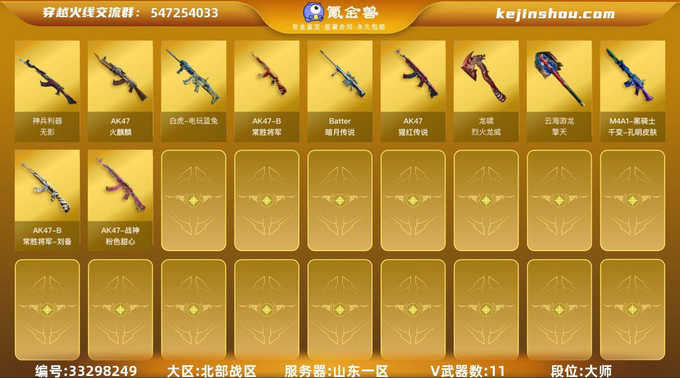山东一区-12V-0王者武器数-0炫金武器数 【热门武器】:白虎-电玩蓝兔 【皮肤】:M4A1-千变-孔明皮肤,战神-粉色甜心皮肤,AK47-B-常胜将军-刘备 【角色】:乔伊教练,修道士,云海玲珑,暗夜-X,电竞少女,芳心审判者,风暴女,虎妞,嘉年华灵狐,兰妹妹,灵狐者-X,麻雀,曼陀罗-X,潘多拉-X,潜龙队-X,青霞仙子,斯沃特-X,兔囡囡,影武者-X,团团 【人偶武器】:火麒麟-灵狐,AWM-灵狐-15周年嘉年华,迷你裂空之翼,夺魂,深渊终结者手雷,迷你超能女侍 【暴走生化】:超级对讲机 【挑战大师】:冰龙粉碎者-白马银枪,激光毁灭者III-白马银枪,激光毁灭者III,神圣爆裂者-末日III 【英雄级武器】:AK47-火麒麟,无影-神兵利器,AK-47-猩红传说*2,AK47-B-常胜将军,白虎-电玩蓝兔,Barrett-暗月传说*2,擎天-云海游龙,龙啸-烈火龙威,手雷-云海游龙,AK47-竞魂无影 【其他武器】:源-黑龙,源·雷神*2,魂·M4A1-雷神-化蛇*2,魂·雷神-神秘按键,魂·雷神-新春神龙*2,魂-雷神-萌杀,魂·雷神-15周年嘉年华,御·雷神-烈虎,源·黑骑士,魂·黑骑士-现代金属*2,魂·黑骑士-幻能朋克,魂·黑骑士-破浪10年,御·黑骑士-冰魄*2,魂-死神-机甲核心,源·天启,源·超新星,源·机械迷城...