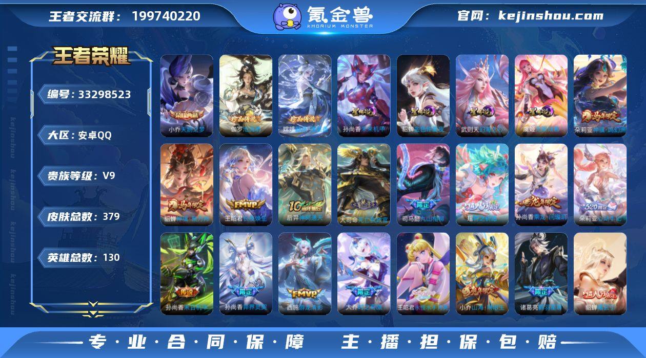 贵族9级,379皮肤,0水晶,2珍品传说,2典藏,41传说,21星元,127史诗,12个性按键,皮肤价 304864;小乔无双冲了一半