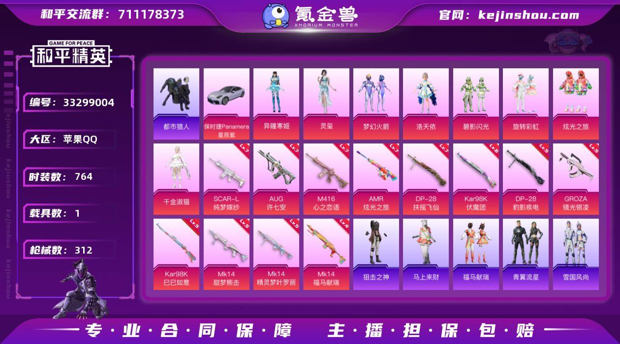 实名: 可修改 时装数: 764 载具数: 1 枪械数: 312 战备数: 1 热门装扮: 梦幻火箭(新101),鹰眼刺客,都市猎人,洛天依,碧影闪光,旋转彩虹,炫光之旅,千金淑猫,灵玺,异瞳寒姬 载具: 保时捷Panamera(星辰紫) 稀有枪皮: Kar98K伏魔团,DP-28扶摇飞仙,M416心之恋语,SCAR-L纯梦嫁纱,AMR炫光之旅,Mk14精灵梦叶罗丽,GROZA-镜光银凌,AUG-许七安,Kar98K-巳巳如意,MK14-甜梦熊击,DP-28-豹影疾电,MK14-福马献瑞 亮点: 【优质装备】:8号机(新粉螳螂),Mark.06(新蓝螳螂),都市猎人,七级AMR-炫光之旅,七级SCAR-L-纯梦嫁纱,七级DP-28-扶摇飞仙,七级M416-心之恋语,七级AUG-许七安