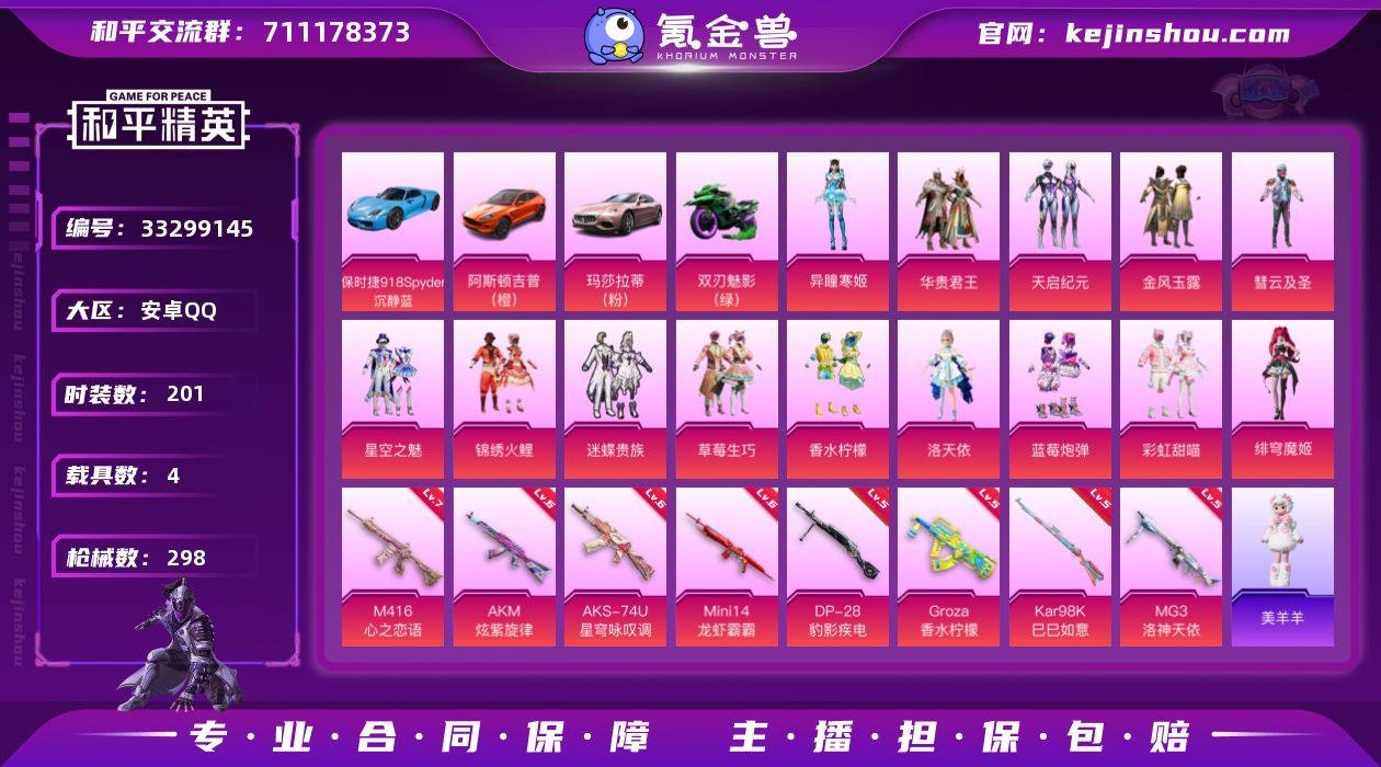 安卓 手Q-15粉装-9特效枪-4载具-5粉色飞行器-103256热力值-6王牌印记-201套装-298枪皮 【粉色套装】:粉装-华贵君王,粉装-天启纪元,粉装-金风玉露,粉装-彗云及圣,粉装-星空之魅,粉装-锦绣火鲤,粉装-迷蝶贵族,粉装-草莓生巧,粉装-香水柠檬,角色-洛天依,粉装-蓝莓炮弹,粉装-彩虹甜喵,角色-绯穹魔姬,角色-异瞳寒姬,角色-镜中幻 【粉色枪皮等级】:AKM-炫紫旋律(六级),M416-心之恋语(七级),GROZA-香水柠檬(五级),AKS-74U-星穹咏叹调(六级),Kar98K-巳巳如意(五级),Mini14-龙虾霸霸(六级),Mk14-福马献瑞(五级),DP-28-豹影疾电(五级),MG3-洛神天依(五级) 【粉色载具】:阿斯顿马丁DBX(橙),玛莎拉蒂Ghibli(粉),保时捷918 Spyder(沉静蓝),双人摩托-双刃魅影(绿) 【粉色枪皮】:AKM-炫紫旋律,M416-心之恋语,GROZA-香水柠檬,AKS-74U-星穹咏叹调,Kar98K-巳巳如意,Mini14-龙虾霸霸,Mk14-福马献瑞,DP-28-豹影疾电,MG3-洛神天依 【粉色飞行器】:PEL轰鸣竞梦者飞行器,潮汐统领飞行器,夏日绵绵冰飞行器,王牌四分卫飞行器,飞天猪飞行器 【粉色降落伞】:快乐主宰降落伞,幻影战神降落伞,春暖花开降落伞,精灵迷巫降落伞,华贵君王降落伞,天启纪...