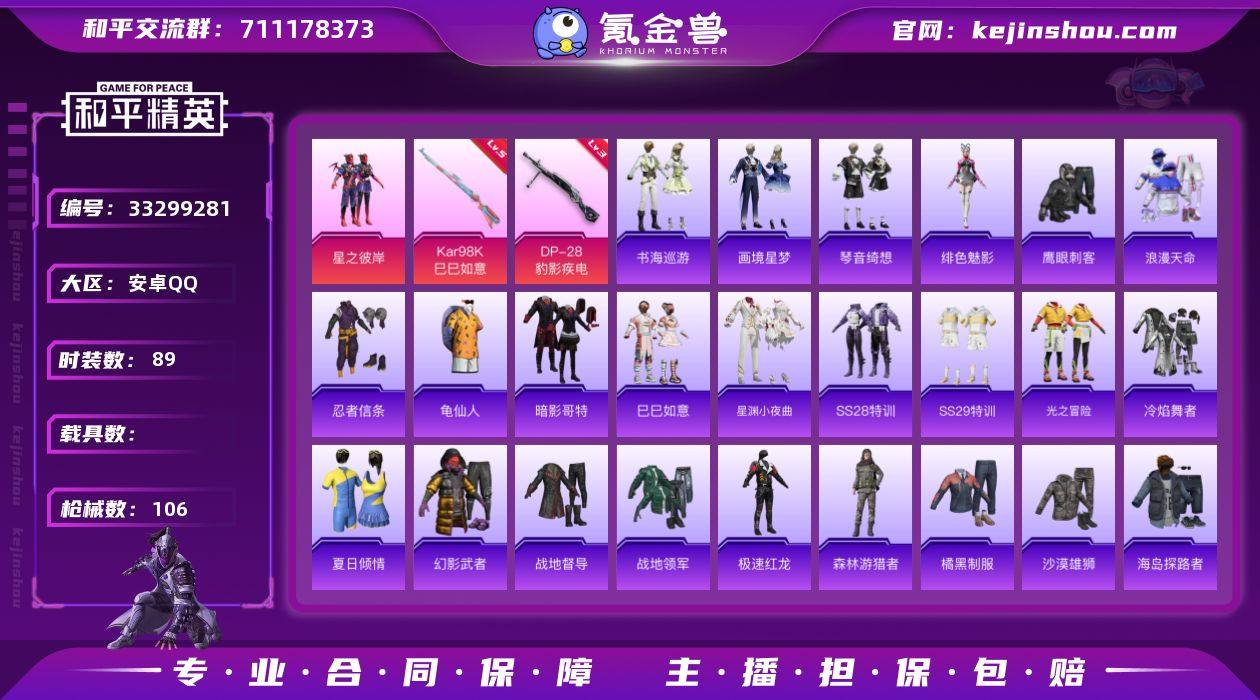 安卓【小号/暗影哥特/萌熊伴侣背包/1粉装-5特效枪-1粉色飞行器】 手Q--27258热力值-2王牌印记-89套装-106枪皮 【热门品类】:套装-浪漫天命,套装-忍者信条,套装-龟仙人,套装-暗影哥特 【粉色套装】:粉装-星之彼岸 【粉色枪皮等级】:UMP45-萌骑冒险(二级),AKS-74U-森灵之息(五级),Kar98K-巳巳如意(五级),Mk14-福马献瑞(五级),DP-28-豹影疾电(三级) 【粉色枪皮】:UMP45-萌骑冒险,AKS-74U-森灵之息,Kar98K-巳巳如意,Mk14-福马献瑞,DP-28-豹影疾电 【粉色飞行器】:炫彩糖果飞行器 【粉色降落伞】:绝对恒星降落伞,幻影战神降落伞,鬼刀降落伞,极意拳锋降落伞,炫彩糖果降落伞 【稀有套装】:套装-龟仙人,套装-巳巳如意,套装-雪国风尚,套装-炫彩糖果,角色-幸运青,套装-马上有钱,套装-迅捷龙虾,套装-星渊小夜曲,角色-绯色魅影,套装-书海巡游,套装-画境星梦,套装-琴音绮想,套装-雨过天青,套装-红釉青花 【稀有枪皮】:AUG-冰晶雪宝,AKM-影袭,AKM-破晓战魂,AKM-龙的传人,SCAR-L-夜灯,SCAR-L-炫彩节奏,SCAR-L-绶带小兔,M416-红色方程式,M416-蓝色火焰,GROZA-影袭,AUG-幻影战神,AUG-甜蜜菠萝,AUG-耀粉歌者,AUG-绝对恒星,M762-登顶巅峰,蜜...