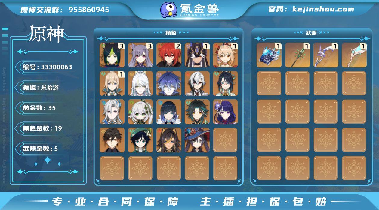 58级/35黄/男主/19个五星角色/5个五星武器 0命阿蕾奇诺,0命闲云,0命那维莱特,0命迪希雅,0命纳西妲,1命赛诺,3命提纳里,0命夜兰,0命雷电将军,0命钟离,0命魈,1命宵宫,0命温迪,3命刻晴,1命琴,0命莫娜,2命迪卢克,0命菲林斯,0命兹白,精1万世流涌大典,精1和璞鸢,精1天空之翼,精1阿莫斯之弓