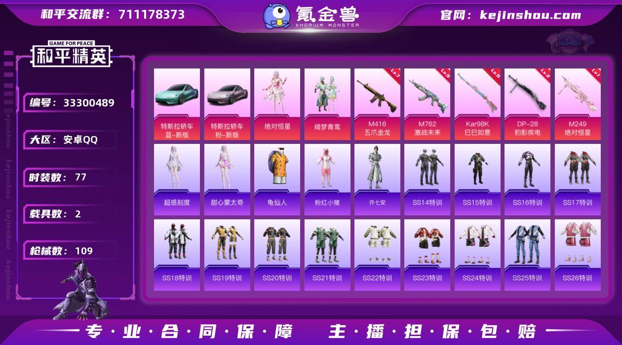 安卓【小号 M416-五爪金龙(七级),M762-激战未来(五级),特斯拉Roadster(水滴蓝),特斯拉Roadster(沁心粉)】 手Q-2粉装-5特效枪-2载具-1粉色飞行器-37721热力值-5王牌印记-77套装-109枪皮 【热门品类】:套装-龟仙人,套装-粉红小猪 【粉色套装】:角色-绝对恒星,粉装-绮梦青鸾 【粉色枪皮等级】:M416-五爪金龙(七级),M762-激战未来(五级),Kar98K-巳巳如意(五级),M249-绝对恒星(一级),DP-28-豹影疾电(三级) 【粉色载具】:特斯拉Roadster(水滴蓝),特斯拉Roadster(沁心粉) 【粉色枪皮】:M416-五爪金龙,M762-激战未来,Kar98K-巳巳如意,M249-绝对恒星,DP-28-豹影疾电 【粉色飞行器】:绝对恒星飞行器 【粉色降落伞】:绝对恒星降落伞,激战未来降落伞,绮梦青鸾降落伞,洛神天依降落伞,音爆索尼克降落伞,星穹咏叹调降落伞,极意拳锋降落伞 【稀有套装】:套装-龟仙人,角色-超感刻度,角色-甜心蒙太奇,套装-雪国风尚,角色-许七安 【稀有枪皮】:AKM-墨染幽兰,AKM-夜灯,AKM-星之彼岸,AKM-萌趣颜团子,AKM-龙的传人,M16A4-幻世战舞者,SCAR-L-炫彩节奏,SCAR-L-玉兔迎春,SCAR-L-王牌四分卫,M416-梨园星光,M416-糯团青竹,M416-红色方程式,GROZA-彩...