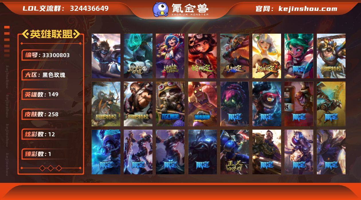 【店主推荐捡漏号】白银段位-149英雄-258皮肤-12炫彩-1终极-2神话-45限定-29传说-69史诗 【神话皮肤】:十周年纪念安妮,源代码乐芙兰 【臻彩皮肤】:霸天巨兽雪崩墨菲特 【年限皮肤】:你看见过我的熊猫吗安妮,替父从军花木兰,春晖神女拉克丝 【冰雪限定】:幸福女神乐芙兰,圣诞狂欢努努和威朗普,圣诞狂欢基兰,阿木木“主人不要我了”,邪恶圣诞老人维迦,夺命美人卡特琳娜,喜庆之树茂凯,圣诞老人古拉加斯,寒冬精灵璐璐,圣诞老人德莱文,冰雪节辛吉德,冰雪节格雷福斯 【终极皮肤】:未来战士伊泽瑞尔 【限定皮肤】:冠军之刃锐雯,冠军典狱长锤石,冠军之刃锐雯2016,冠军之隐劫,Fnatic古拉加斯,Fnatic迦娜,暗杀星慎,SKTT1婕拉,SSW图奇,SSW雷恩加尔,SKTT1阿利斯塔,iG艾瑞莉娅,胜利枪神格雷福斯,胜利女神奥莉安娜,胜利之剑亚托克斯,海贼瑞兹,鬼影重重魔腾,死亡誓约劫,泳池派对李青,蒙多蒙多,密林猎手提莫,野兽猎人德莱文,野兽猎人瑟庄妮,野兽猎人泰达米尔,波比的巧克力工坊,钢铁之翼艾尼维亚,防暴机器人布里茨,防暴士兵辛吉德,防暴天使凯尔,惊悚派对阿木木 【传说皮肤】:魔幻卡牌崔斯特,战地机甲厄加特,邪鸦魅影乐芙兰,大天使长米迦勒...
