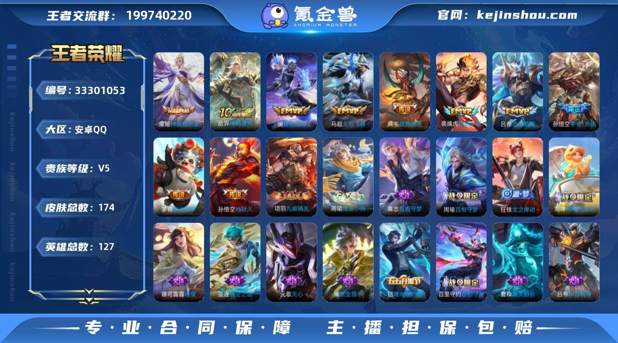 安卓Q-V5-永恒钻石V段位-127英雄-174皮肤-1典藏皮肤-9传说-32史诗 【荣耀典藏】:虞姬神鉴启示录 【传说皮肤】:后羿神树通天,裴擒虎祥瑞亨通,典韦战鼓燎原,澜逐花归海,吕布怒海麟威,马超无双飞将,孙悟空零号赤焰,梦奇胖达荣荣,孙悟空地狱火 【限定皮肤】:蔡文姬夏日便利店,大乔绒语心约,虞姬夏日便利店,姜子牙天穹之誓,狄仁杰阴阳师,赵云皇家上将,孙尚香蔷薇恋人,庄周高山流水,元歌无心,狄仁杰魔术师,项羽海滩派对,孙悟空零号赤焰,李元芳云中旅人,雅典娜单词大作战,桑启海盐诗旅,张良古海寻踪,鬼谷子天穹祈灯,刘邦剑破天穹,镜青焰无极,项羽苍威无极,周瑜熔金海岸 【赛季限定】:李元芳云中旅人,桑启海盐诗旅,张良古海寻踪,鬼谷子天穹祈灯,刘邦剑破天穹,姜子牙天穹之誓,东皇太一噬灭天穹,太乙真人谧流熔炉,钟馗虚灵犬护,甄姬逆浪荇歌,亚瑟荣光之誓,牛魔星界战将,项羽九幽镇关 【战令限定】:雅典娜单词大作战,镜青焰无极,项羽苍威无极,蔡文姬夏日便利店,虞姬夏日便利店,亚连破空之剑,孙悟空神迹守卫,百里守约百相守梦,老夫子百相守梦,刘禅鸭鸭历险记,沈梦溪鸭鸭历险记,周瑜百相守梦,孙策百相守梦,周瑜线条小狗 【史诗...