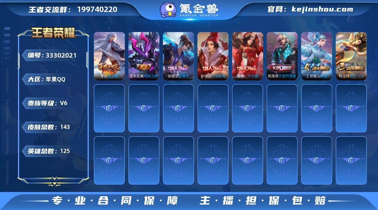 苹果Q 可二次 125英雄143皮肤 凤求凰 地狱之眼 末日机甲女 至尊宝 天狼狩猎者 大圣娶亲 一生所爱 猎兽之王 蓝屏警告 神迹守卫钟馗 狮舞东方 朔望之晖 死神来了 梁祝 原初探秘者 水晶猎龙者 暗隐猎兽者 猫狗日记男 猫狗日记女 金属风暴 白昼王子 黄金分割率 逐浪之夏 白龙吟 功夫厨神 圣诞恋歌 幽灵船长 乘风破浪 末日机甲男 偶像歌手 缤纷独角兽 鬼剑武藏 德古拉伯爵 花好人间 狮心王 蜃楼王 妖精王 炼金王 凯尔特女王 狰 饕餮 烛龙 重明 穷奇 御狮 御霄 御旌 御銮 朔风刀 混沌棋 疑决卦 醍醐杖 万华元夜 演武夺筹 黑猫爱糖果 驱傩正仪 未来纪元赵云 如懿 千军破阵 拳王 沙漠行僧 金庭之子 霸王丸 云中旅人 丁香结 皇家上将 魅力维加斯 探海日志 水果甜心 王者之锤 遇见飞天 鹰眼统帅 魔术师 王者荣耀账号