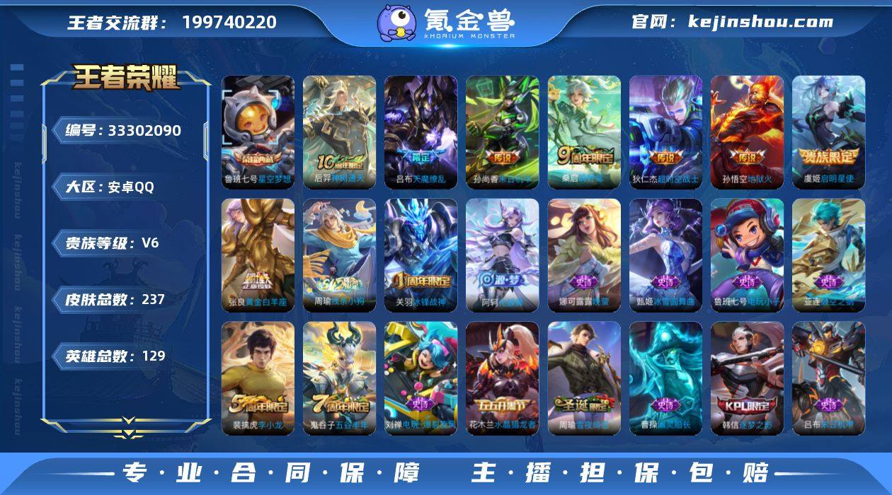 安卓Q-V6-永恒钻石IV段位-129英雄-237皮肤-1典藏皮肤-8传说-58史诗 【荣耀典藏】:鲁班七号星空梦想 【传说皮肤】:后羿神树通天,桑启鸣野蒿,虞姬启明星使,张良黄金白羊座,孙尚香末日机甲,孙悟空地狱火,吕布天魔缭乱,狄仁杰超时空战士 【限定皮肤】:白起狰,姜子牙天穹之誓,狄仁杰阴阳师,虞姬凯尔特女王,赵云皇家上将,妲己热情桑巴,嬴政优雅恋人,嬴政白昼王子,庄周高山流水,高渐离死亡摇滚,孙膑妖精王,扁鹊炼金王,芈月重明,吕布天魔缭乱,吕布猎兽之王,夏侯惇朔风刀,甄姬游园惊梦,曹操烛龙,典韦穷奇,狄仁杰魔术师,狄仁杰万华元夜,项羽海滩派对,老夫子醍醐杖,关羽冰锋战神,程咬金演武夺筹,韩信逐梦之影,孙悟空美猴王,牛魔御旌,虞姬启明星使,钟馗驱傩正仪,杨玉环遇见飞天,哪吒逐梦之翼,雅典娜黎明之约,太乙真人饕餮,鬼谷子原初探秘者,鬼谷子五谷丰年,百里玄策原初追逐者,弈星混沌棋,明世隐疑决卦,裴擒虎李小龙,裴擒虎擒涛扼浪,狂铁御狮,米莱狄御霄,盾山御銮,上官婉儿梁祝,鲁班大师探海日志,阿古朵江河有灵,张良古海寻踪,蒙犽百解令,鬼谷子天穹祈灯,沈梦溪龙舞盛年,刘邦剑破天穹 【年限皮肤】:孙悟空美猴王 【赛季限...