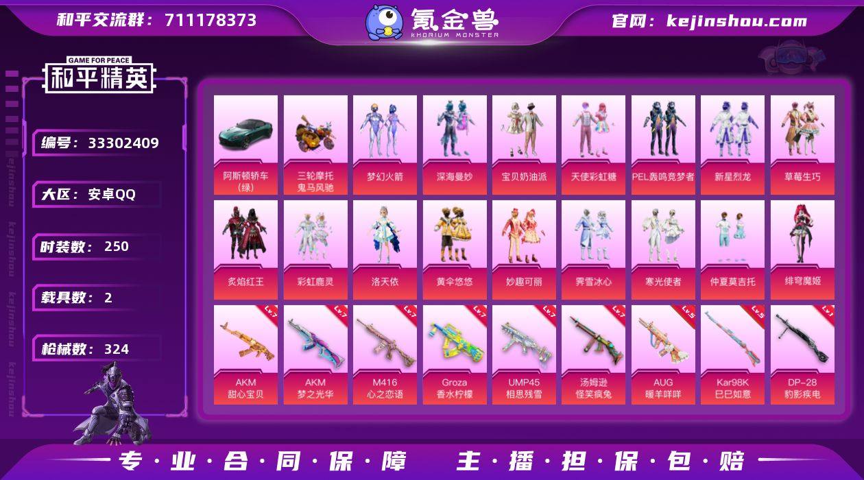 【kyhp1808】安卓 手Q-16粉装-9特效枪-2载具-3粉色飞行器-110265热力值-15王牌印记-250套装-324枪皮 【热门品类】:粉装-梦幻火箭,套装-浪漫天命,套装-SS1特训,套装-龟仙人,套装-潮萌小黄鸭,套装-浪漫波比,套装-粉红小猪 【粉色套装】:粉装-深海曼妙,粉装-宝贝奶油派,粉装-天使彩虹糖,粉装-梦幻火箭,粉装-PEL轰鸣竞梦者,粉装-新星烈龙,粉装-草莓生巧,粉装-炙焰红王,粉装-彩虹鹿灵,角色-洛天依,粉装-黄伞悠悠,粉装-妙趣可丽,粉装-霁雪冰心,粉装-寒光使者,粉装-仲夏莫吉托,角色-绯穹魔姬 【粉色枪皮等级】:AKM-甜心宝贝(七级),AKM-梦之光华(七级),M416-心之恋语(七级),GROZA-香水柠檬(七级),AUG-暖羊咩咩(五级),UMP45-相思残雪(七级),汤姆逊-怪笑疯兔(七级),Kar98K-巳巳如意(五级),DP-28-豹影疾电(一级) 【粉色载具】:阿斯顿马丁DBS(绿),鬼马风驰 【粉色枪皮】:AKM-甜心宝贝,AKM-梦之光华,M416-心之恋语,GROZA-香水柠檬,AUG-暖羊咩咩,UMP45-相思残雪,汤姆逊-怪笑疯兔,Kar98K-巳巳如意,DP-28-豹影疾电 【粉色飞行器】:春暖花开飞行器,庄周梦蝶飞行器,千面幻镜飞行器 【粉色降落伞】:深海曼妙降落伞,甜心宝贝降落伞,春暖花开降...
