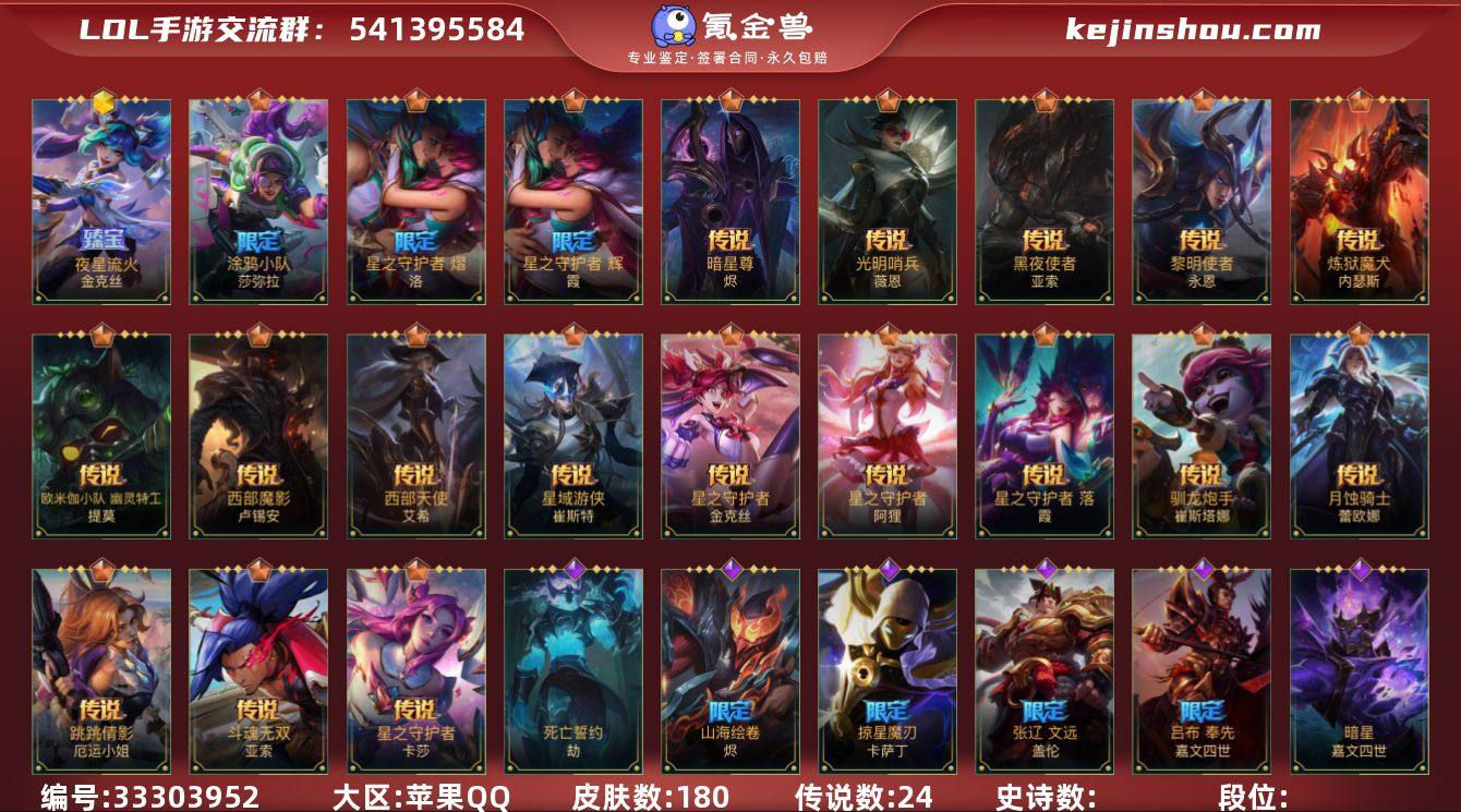MLL1473有二次【180皮肤 1神话 24传说】 苹果Q-英雄110-皮肤180-传说24 段位:黑铁 夜星流火金克斯 光明哨兵薇恩 黑夜使者亚索 炼狱魔犬 欧米伽小队 幽灵特工 星之守护者 辉 西部魔影卢锡安 西部天使寒冰 星域游侠卡牌 星之守护者金克丝 星之守护者阿狸 暗星尊 驯龙炮手 月蚀骑士蕾欧娜 涂鸦小队莎弥拉 黎明使者永恩 跳跳倩影女枪 斗魂无双亚索 星之守护者卡莎 星之守护者 落 腥红之月烬 星之守护者女枪 星之守护者风女 死亡誓约劫 睡衣守护者EZ 秘旅探索者加里奥 末路管家 魔女青钢影 暮星之羽 欧米伽小队 魔鬼伞兵 破败军团女枪 灵魂莲华亚索 战场之王亚索 战斗教授男枪 张辽 文远 真实伤害赛娜 神龙尊者 玉境灵龙 神龙尊者 苍龙 灵魂莲华提莫 掠星魔刃卡萨丁 灭迹行者烬 战场之王机器人 源计划:阴 驯龙女巫 银河魔装机神龙女 泳池派对璐璐 泳池派对盲僧 源计划:雄心 源计划:升华 源计划:山 源代码索拉卡 玉剑传说 无双 玉剑传说 寒潭夭夭 黑夜使者莉莉娅 斗魂无双赵信 黑夜使者吸血鬼 星域巫灵薇古丝 灵魂莲华小炮 小蜜蜂提莫 猛虎布隆 源计划:雷 战斗学院蕾欧娜 海之歌萨勒芬妮 海之歌寒冰 太空律动努努 山海绘卷烬 星之守护者璐璐 K/DA ALL OUT阿卡丽 K/DA ALL OUT...