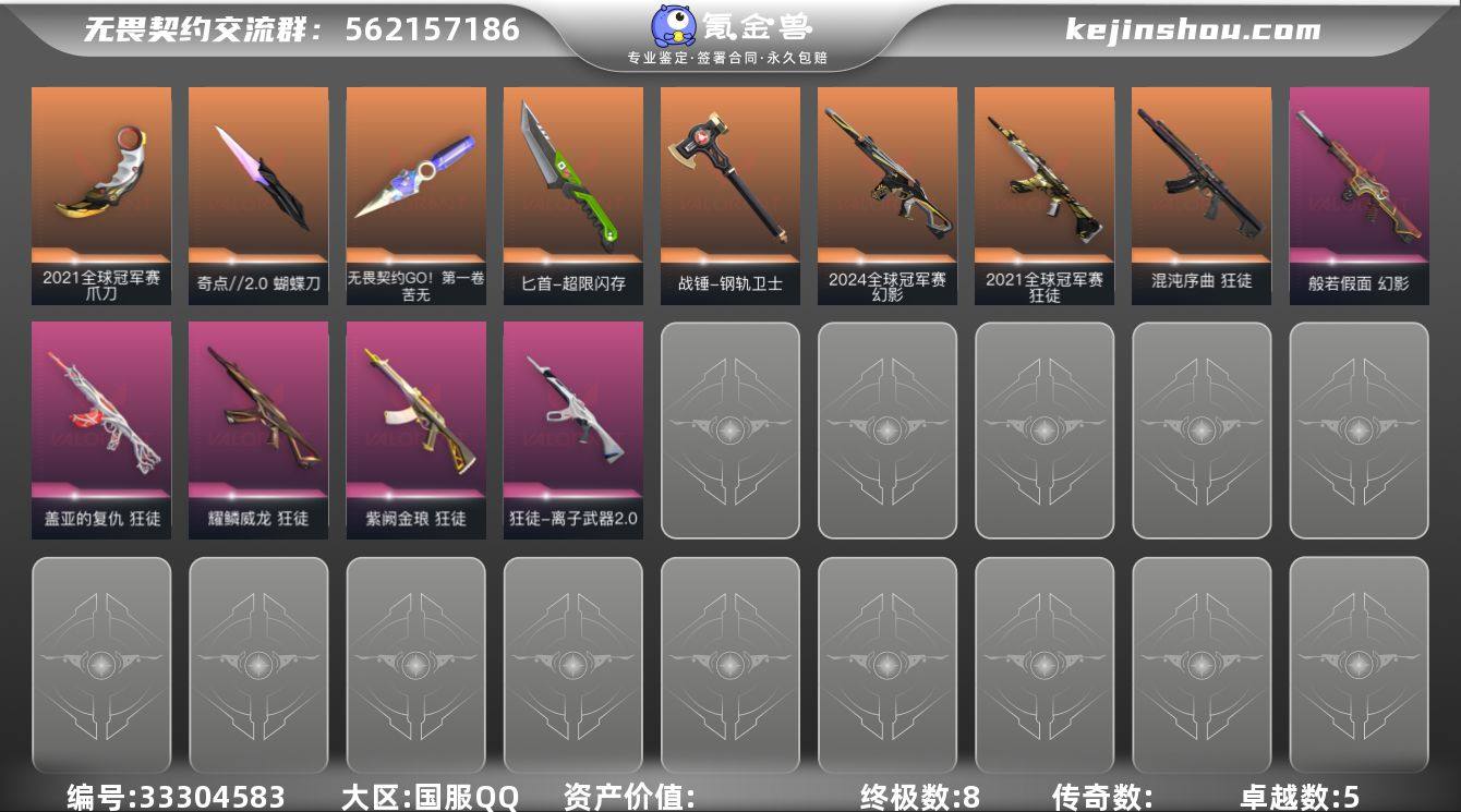 【套装】:2021全球冠军赛套装 【英雄】:幻棱,炼狱,维斯,暮蝶,钛狐,壹决,铁臂,捷风,雷兹,幽影,不死鸟,贤者,猎枭,蝰蛇,零,芮娜,奇乐,尚勃勒,霓虹,斯凯,夜露,星礈,K/O,海神,盖可,黑梦,钢锁 【近战武器】:近战武器-2021全球冠军赛 爪刀,近战武器-无畏契约GO!第一卷 苦无,近战武器-奇点//2.0 蝴蝶刀,近战武器-超限闪存 匕首,近战武器-钢轨卫士 战锤 【狂徒】:狂徒-2021全球冠军赛,狂徒-混沌序曲,狂徒-盖亚的复仇,狂徒-耀鳞威龙,狂徒-紫阙金琅,狂徒-离子武器//2.0,狂徒-钢轨卫士 【幻影】:幻影-2024全球冠军赛,幻影-般若假面,幻影-超限闪存,幻影-战术小伙伴 【戍卫】:戍卫-钢轨卫士,戍卫-浮光跃金 【獠犬】:獠犬-模拟赫兹,獠犬-战术小伙伴 【冥驹】:冥驹-模拟赫兹 【飞将】:飞将-光导纤维 【莽侠】:莽侠-超限闪存 【战神】:战神-浮光跃金 【奥丁】:奥丁-战术小伙伴 【雄鹿】:雄鹿-模拟赫兹 【骇灵】:骇灵-浮光跃金,骇灵-光导纤维 【蜂刺】:蜂刺-超限闪存,蜂刺-战术小伙伴 【标配】:标配-浮光跃金,标配-光导纤维 【正义】:正义-超限闪存,正义-纳米打击 【鬼魅】:鬼魅-诡秘蛇影,鬼魅-光导纤维,鬼魅-模拟赫兹 【狂...