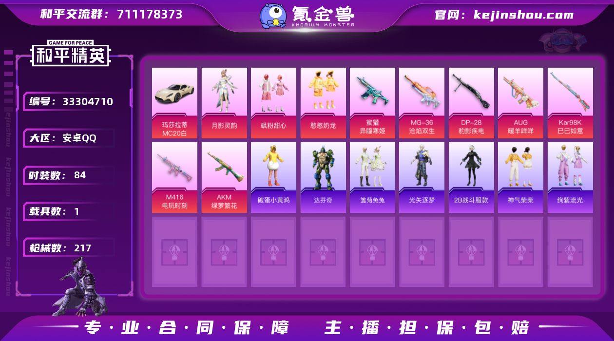 HJ6559 可二游戏68级 1车4粉7特 164套装212枪皮 15印记 【1载具】 玛莎拉蒂M白色 【4粉装】 憨憨奶龙 月影灵韵 羊梦糖心 飒粉甜心 【7特效枪】 M416-电玩时刻 (5级) AKM-绿萝繁花 (5级) Kar98K-巳巳如意 (5级) MG-36-沧焰双生 (5级) DP-28-豹影疾电 (5级) AUG-暖羊咩咩 (5级) 蜜獾-异瞳寒姬 (4级) 【5热门】 龟仙人 2B战斗服款 迅捷狂鲨 破蛋小黄鸡 极速红龙 【1飞行器】 黄族统领飞行器 【1头盔】 梦幻火箭头盔 【2背包】 梦幻火箭背包 百万伏特背包