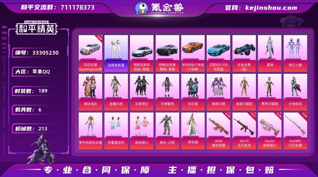 【LHPX2379】189套装/枪械11/装备302/载具6/战备179/王牌印记15/热力值95665/二级AKM-炫紫旋律/一级AKM-星际浪客/九级AKM-盖世英雄/四级SCAR-L-纯梦嫁纱/七级M416-五爪金龙/一级M416-心之恋语/四级M762-甜蜜誓约/五级Vector-飒粉甜心/四级P90-能量风暴/五级Kar98K-巳巳如意/一级Mk14-福马献瑞/六级玛莎拉蒂Quattroporte(幻星粉)/梦幻火箭(新101)/缤纷油彩/动感兔斯基/2B战斗服款/套装-SS1特训/龟仙人/潮萌小黄鸭/暗影哥特/粉红小猪/熔岩游骑兵连帽夹克/金曜白虎/古堡领主/天禅智恒/向日葵/极致幻想/迪迦闪耀型/赛罗闪耀型/沙场疾风/零号机款机体服/仲夏莫吉托/飒粉甜心/幻影/萨利娅/星渊/玛莎拉蒂Quattroporte(幻星粉)/特斯拉Model X(冷光银)/特斯拉Roadster(尊享铂)/宾利欧陆GT敞篷(火焰橘)/迈凯伦570S(天际蓝)/合金龙骨(蓝)/AKM炫紫旋律/AKM星际浪客/AKM盖世英雄/SCAR-L纯梦嫁纱/M416五爪金龙/M416心之恋语/M762甜蜜誓约/Vector飒粉甜心/P90能量风暴/Kar98K-巳巳如意/Mk14-福马献瑞/绝对恒星飞行器/飞行器-古堡领主/飞行器-心之恋语/变形金刚飞行器/绝对恒星降落伞/未来战士降落伞/凝视深渊降落伞/至尊龙雀降落伞/炫紫旋律降落伞/神秘黑猫降落伞/古堡领主降落伞/繁花小夜...