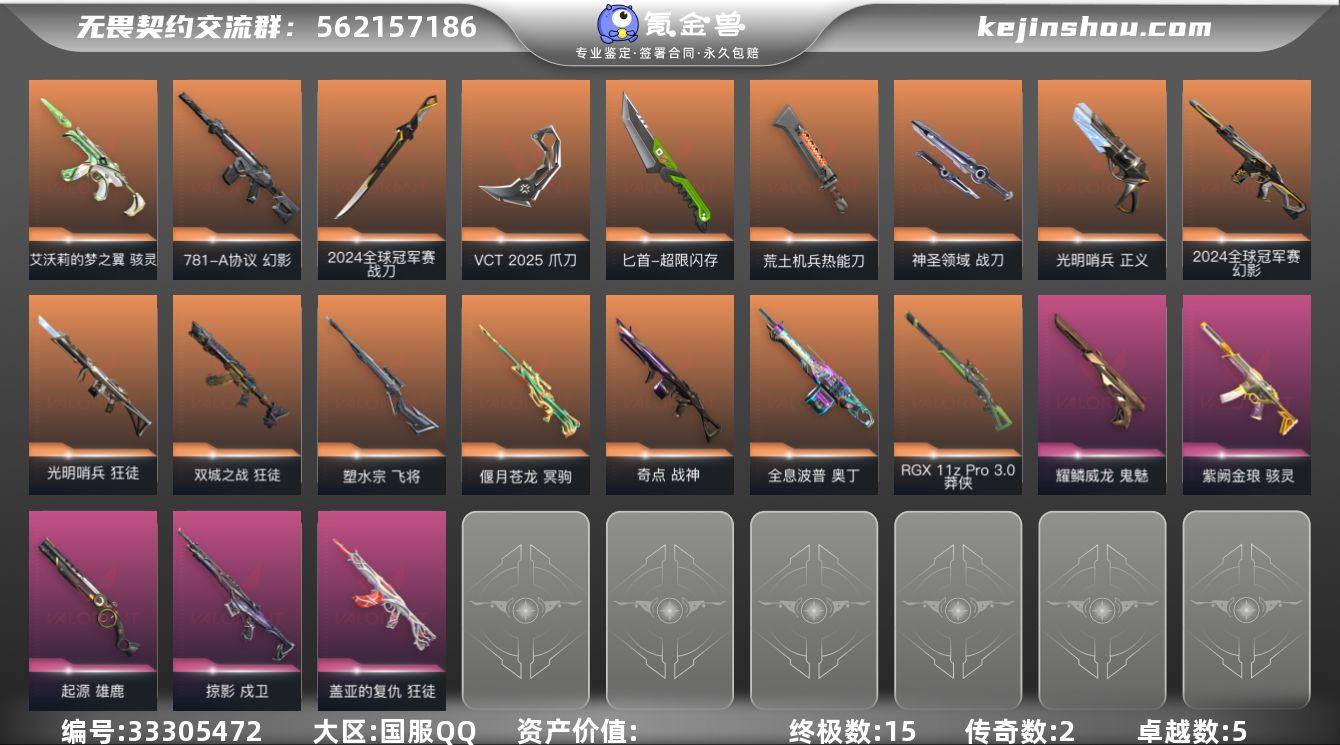 【qyz9874】可二次 玩够可回血 24冠军套 VCT爪刀 精品账号 qyz9874 【近战武器】:近战武器-2024全球冠军赛 战刀,近战武器-VCT 2025 爪刀,近战武器-黑波之刃,近战武器-超限闪存 匕首,近战武器-荒土机兵 热能刀,近战武器-神圣领域 战刀 【狂徒】:狂徒-光明哨兵,狂徒-双城之战,狂徒-盖亚的复仇,狂徒-荒土机兵,狂徒-诡秘蛇影 【幻影】:幻影-2024全球冠军赛,幻影-781-A协议,幻影-超限闪存,幻影-神圣领域,幻影-纳米打击,幻影-末日之翼 【戍卫】:戍卫-掠影,戍卫-浮光跃金,戍卫-逆冲蛮牛,戍卫-月球哨兵,戍卫-折光棱晶 【獠犬】:獠犬-神圣领域,獠犬-模拟赫兹,獠犬-逆冲蛮牛 【冥驹】:冥驹-偃月苍龙,冥驹-荒土机兵,冥驹-模拟赫兹,冥驹-星云暗涌 【飞将】:飞将-塑水宗,飞将-末日之翼 【莽侠】:莽侠-RGX 11z Pro//3.0,莽侠-超限闪存,莽侠-诡秘蛇影,莽侠-月球哨兵 【战神】:战神-奇点,战神-神圣领域,战神-浮光跃金 【奥丁】:奥丁-全息波普,奥丁-巨神铁甲,奥丁-纳米打击,奥丁-末日之翼 【判官】:判官-诡秘蛇影,判官-纳米打击x 【雄鹿】:雄鹿-起源,雄鹿-模拟赫兹,雄鹿-逆冲蛮牛,雄鹿-月球哨兵 【骇灵】:骇灵-艾沃莉的梦之翼,骇灵-紫阙金...