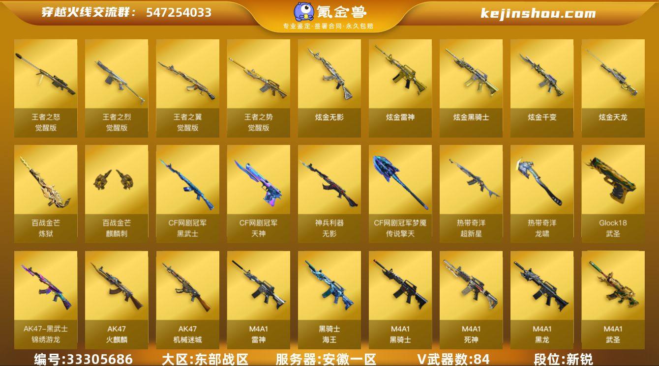安徽一区-87V-15王者-6炫金 【热门武器】:QBZ03-金色蔷薇,M14EBR-玄武,HK417-朱雀,M4A1-青龙,M200-幻神,柯尔特-冠军之特,Kar98K-星神,金色小号,Cat-刀锋,炼狱-迷你小钢,毒蜂,M4A1-黑骑士*2,汤姆逊-烈龙*6,加特林-炼狱*3,金色蔷薇-空,雷神-小红,COP-白鲨,沙鹰-修罗*3,Knife-冠军之刃,金刚伞 【王者炫金武器】:炫金骑士,炫金无影*2,炫金千变,炫金雷神,炫金天龙,王者之魄高爆手雷,王者之魄闪光弹*2,王者之魄烟雾弹 【音效卡】:M4A1-雷神音效卡,M4A1-黑骑士音效卡,Barrett-毁灭音效卡,QBZ03-天罚音效卡,炼狱-百战金芒-庆典舞曲音效卡,传情小小语音包 【皮肤】:幻神-冠军之幻,幻神-降龙,幻神-星火小队签名臻藏版 皮肤,QBZ03-巅峰荣耀皮肤,星神-漫游,Kar98K-星神-冠军之星皮肤,雷神-暗月,雷神-星空,雷神-虎将,雷神-耀金皮肤,雷神-脉冲核心,M4A1-雷神-巅峰荣耀皮肤,M4A1-再燃火线,火麒麟-华夏之心*2,火麒麟-轻羽皮肤,火麒麟-平天大圣,火麒麟-心动糖果,毁灭耀金皮肤,毁灭-战神张飞,毁灭-直播专属,毁灭-英雄计划 皮肤,M4A1-千变-孔明皮肤*2,黑龙-暗月,M4A1-黑龙-361,黑龙-墨子皮肤,黑骑士-暗月,黑骑士-战神马超,黑骑士-...
