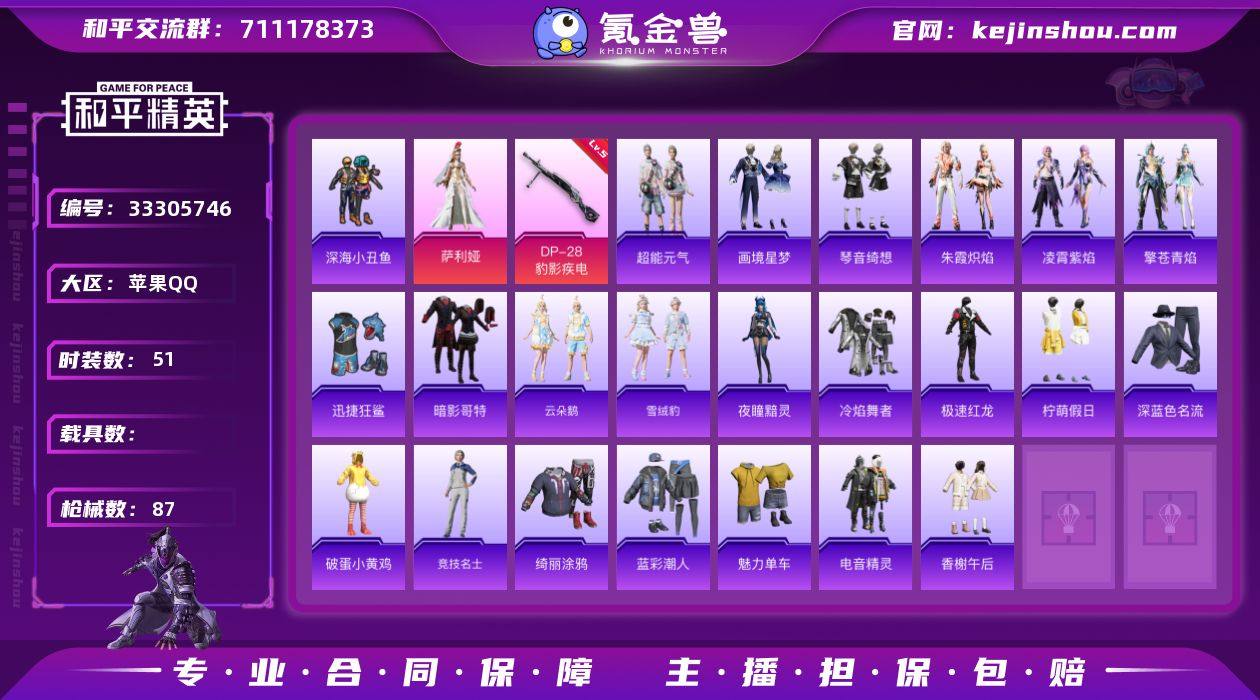 苹果【小号 套装-暗影哥特,DP-28-豹影疾电(五级)】 手Q-1粉装-1特效枪-0载具-2粉色飞行器-21183热力值-4王牌印记-51套装-87枪皮 【热门品类】:套装-深海小丑鱼,套装-暗影哥特 【粉色套装】:角色-萨利娅 【粉色枪皮等级】:DP-28-豹影疾电(五级) 【粉色枪皮】:DP-28-豹影疾电 【粉色飞行器】:绝对恒星飞行器,炫彩糖果飞行器 【粉色降落伞】:第五大道降落伞,鬼刀降落伞,幻彩电音降落伞,绯穹魔姬降落伞,炫彩糖果降落伞,鸢尾珑雾降落伞 【稀有套装】:套装-超能元气,套装-雪国风尚,套装-炫彩糖果,套装-迅捷龙虾,套装-云朵鹅,套装-雪绒豹,角色-夜瞳黯灵,套装-朱霞炽焰,套装-凌霄紫焰,套装-擎苍青焰,套装-画境星梦,套装-琴音绮想,套装-雨过天青,套装-红釉青花 【稀有枪皮】:AUG-冰晶雪宝,AKM-破晓战魂,AKM-龙的传人,SCAR-L-炫彩节奏,M416-红色方程式,AUG-耀粉歌者,AUG-绝对恒星,QBZ-彩虹符号,M762-彩虹符号,M762-第五大道,M762-云朵鹅,蜜獾-绯穹魔姬,ACE32-画境星梦,ARX-凌霄紫焰,UZI-啾咪啾咪,UZI-红色方程式,UMP45-蓝色火焰,MP5K-画境星梦,AKS-74U-鬼刀,JS9-凌霄紫焰,Kar98K-红色方程式,M24-炫彩节奏,SKS-炫彩节奏,SVD-云朵鹅...