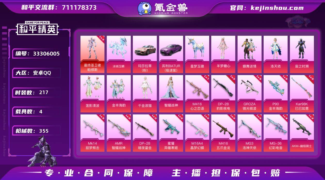 【LHPX2265】217套装/枪械20/装备437/载具4/战备236/王牌印记19/热力值113844/三级AKM-幽焰骑士/四级M16A4-晶梦幻蝶/四级M416-五爪金龙/七级M416-心之恋语/五级GROZA-镜光银凌/四级蜜獾-异瞳寒姬/四级UMP45-萌骑冒险/三级Vector-最终圣卫者/四级MP7-G-水中影/五级P90-金丰海韵/五级Kar98K-巳巳如意/三级M24-镜域双华/五级MK14-甜梦熊击/三级Mk14-福马献瑞/五级AMR-智耀战神/五级DP-28-暗夜鎏金/五级DP-28-豹影疾电/四级MG3-洛神天依/四级MG-36-幻彩电音/五级破片手榴弹-招财进宝/三级最终圣卫者-帕修斯/最终圣卫者-帕修斯/浪漫天命/小丑鱼/龟仙人/暗影哥特/8号机/Mark.06/蝶舞迷情/洛天依/宙之时溯/莲影清波/金丰海韵/千金淑猫/智耀战神/羊梦糖心/玛莎拉蒂Ghibli(粉)/宾利BATUR(极速紫)/星梦玉骢/冰绡玉鳞/AKM-幽焰骑士/M16A4-晶梦幻蝶/M416五爪金龙/M416心之恋语/GROZA-镜光银凌/蜜獾-异瞳寒姬/UMP45-萌骑冒险/Vector-最终圣卫者/MP7-G-水中影/P90-金丰海韵/Kar98K-巳巳如意/M24镜域双华/MK14-甜梦熊击/Mk14-福马献瑞/AMR-智耀战神/DP-28暗夜鎏金/DP-28-豹影疾电/MG3洛神天依/MG-36-幻彩电音/破片手榴弹-招财进宝/炫彩糖果飞行器/黄族统领飞行器/沙丘之主天马飞行器/镜域双华...