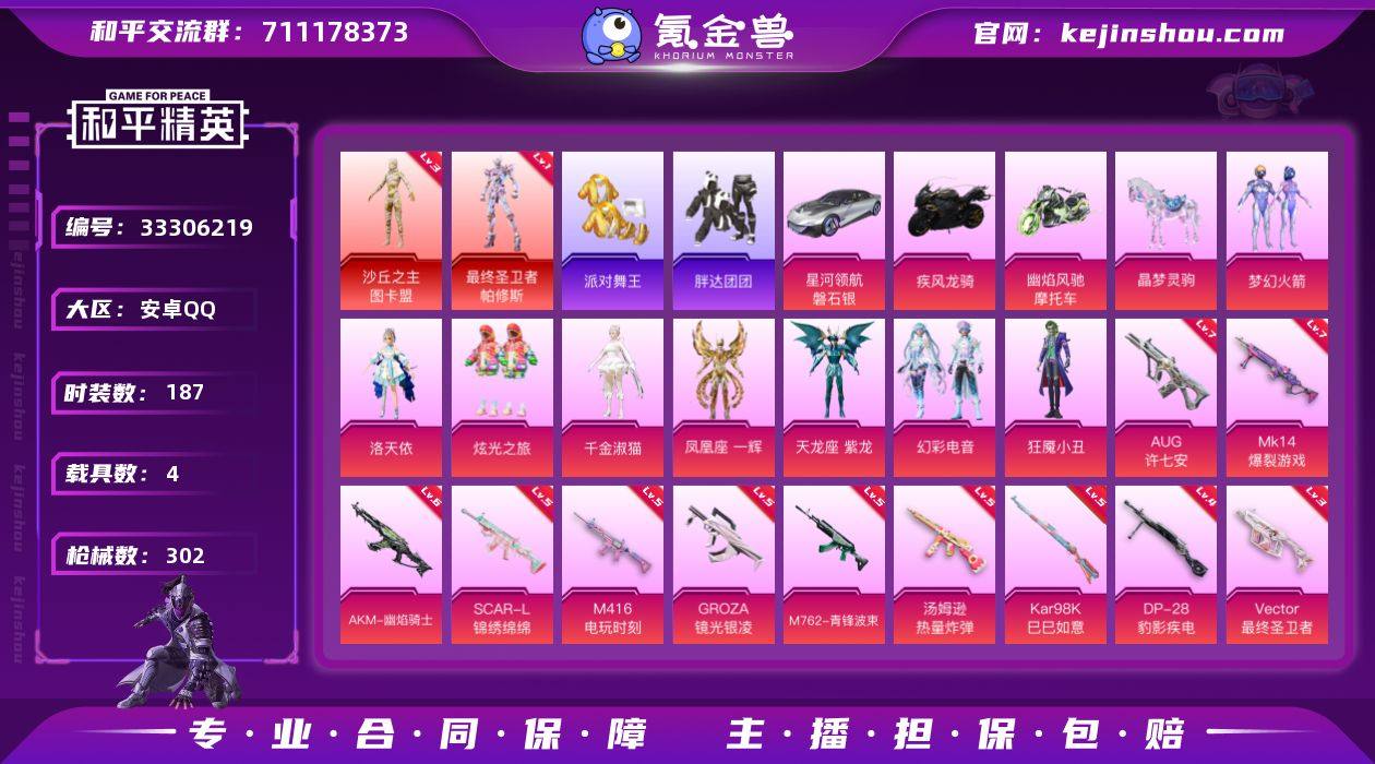 安卓【红装号 最终圣卫者-帕修斯(一级)/沙丘之主-图卡盟(三级)/粉装-梦幻火箭/套装-派对舞王/套装-暗影哥特/蓝螳螂/角色-洛天依/角色-千金淑猫/AKM-幽焰骑士(六级)/SCAR-L-锦绣绵绵(五级)/M416-电玩时刻(五级)/萌熊伴侣背包】 手Q-2神装-8粉装-19特效枪-4载具-11粉色飞行器-99622热力值-7王牌印记-187套装-302枪皮 【红色神装等级】:最终圣卫者-帕修斯(一级),沙丘之主-图卡盟(三级) 【红色角色神装】:最终圣卫者-帕修斯,沙丘之主-图卡盟 【热门品类】:粉装-梦幻火箭,套装-派对舞王,角色-军刀雅典娜,套装-胖达团团,套装-AG战队服,套装-龟仙人,套装-暗影哥特,套装-红红火火,角色-8号机,角色-Mark.06,M416-星际漫游 【粉色套装】:粉装-梦幻火箭,角色-洛天依,粉装-炫光之旅,角色-千金淑猫,角色-凤凰座 一辉,角色-天龙座 紫龙,粉装-幻彩电音,角色-狂魇小丑 【粉色枪皮等级】:AKM-幽焰骑士(六级),SCAR-L-锦绣绵绵(五级),M416-电玩时刻(五级),GROZA-镜光银凌(五级),AUG-许七安(七级),M762-青锋波束(五级),蜜獾-诸神·破晓(三级),Vector-最终圣卫者(三级),汤姆逊-热量炸弹(五级),AKS-74U-森灵之息(五级),P90-沙丘之主(三级),Kar98K-巳巳如意(五级)...