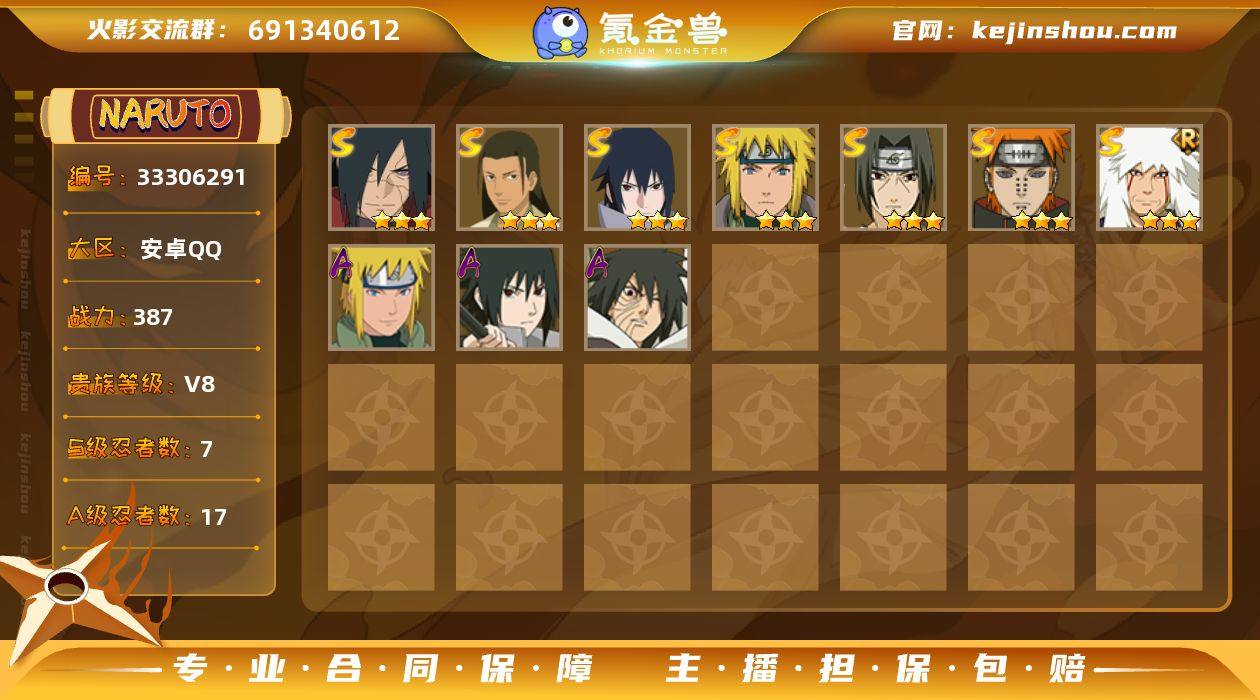 【火影忍者】战斗力:387W+;段位:见习1阶;VIP:V8级;S忍:7个;A忍:17个;通灵兽:13个,S忍:秽土转生解宇智波斑|天道佩恩|永恒万花筒宇智波佐助|木叶创立千手柱间|舞之豪杰自来也|波风水门|须佐能乎宇智波鼬__A忍:忍界大战日向宁次|秽土转生迪达拉|青年波风水门|近松十人卫千代|须佐能乎宇智波佐助|暴怒宇智波带土|死司凭血飞段|疾风传我爱罗|迪达拉(普通)|迈特凯(普通)|宇智波鼬(普通)|干柿鬼鲛(普通)|蝎(普通)|猿飞阿斯玛(普通)|桃式显现漩涡博人|六代目水影长十郎|宇智波泉奈__通灵兽:忍犬(普通)|蓝蛇|砂之守鹤|蛤蟆吉|忍龟|镰鼬|猿魔|山椒鱼|蜃|鲛鲨|蛤蟆仙人|蛤蟆健|乌鸦(普通)