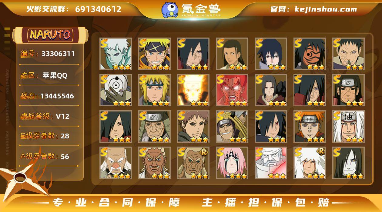IOS/28S忍/56A忍/战力1344W/V12/区服819 【S忍者】 宇智波带土「十尾人柱力」,宇智波佐助「漩涡鸣人」,宇智波斑「秽土转生·解」,千手柱间「木叶创立」,宇智波佐助「永恒万花筒」,神秘面具男「红夜之刃」,春野樱「忍界大战」,大筒木金式,漩涡鸣人「九喇嘛连结」,大野木「忍界大战」,迈特凯「死门」,宇智波斑「木叶创立」,宇智波带土「忍界大战」,千手柱间「秽土转生」,罗砂「四代目风影」,自来也「舞之豪杰」,宇智波鼬「秽土转生」,宇智波斑「秽土转生」,艾「三代目雷影」,宇智波斑「白面具」,金角银角「秽土转生」,猿飞日斩「秽土转生」,宇智波斑,艾「四代目雷影」,佩恩「天道」,波风水门,大蛇丸,自来也, 【A忍者】 小南「漂泊浪客」,宇智波鼬「新春限定」,千手扉间「漂泊武士」,照美冥「夏日泳装」,小南「神驹佑将」,巳月「仙人模式」,迈特凯「青春爆炸」,土台「忍界大战」,纲手「侠隐江湖」,长十郎「六代目水影」,日向宁次「忍界大战」,漩涡博人「桃式显现」,宇智波鼬「夏日限定」,日向雏田「最终章」,旗木卡卡西「幻之真容」,李洛克「忍界大战」,宇智波泉奈,宇智波止水,长门「青年」,艾「青年」,达鲁伊「五代目雷影」,神秘面具男「忍者之路」,波风水门「青年」,奇拉比「...