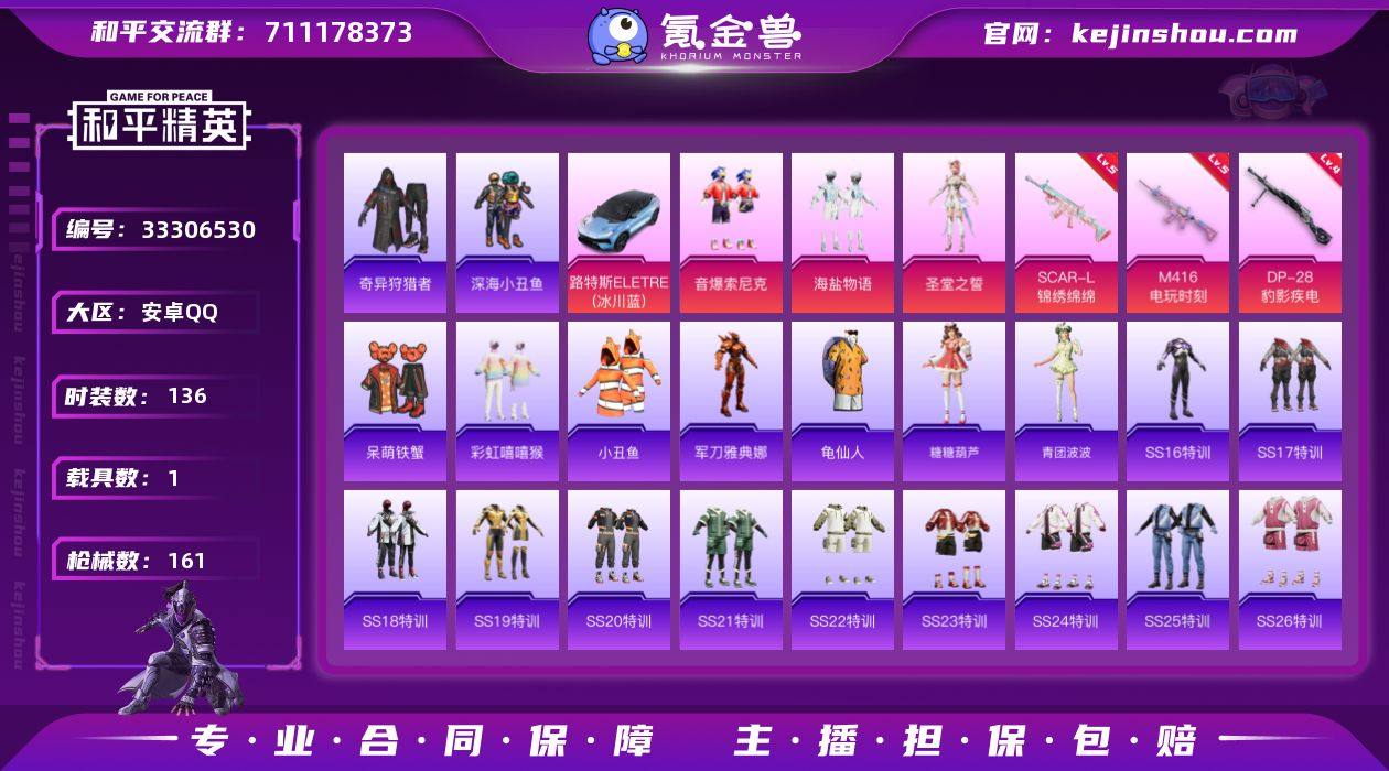 安卓手Q-3粉装-3特效枪-1载具-2粉色飞行器-52813热力值-4王牌印记-136套装-161枪皮 【热门品类】:粉装-音爆索尼克,套装-深海小丑鱼,套装-小丑鱼,套装-奇异狩猎者,角色-军刀雅典娜,套装-龟仙人 【粉色套装】:粉装-海盐物语,粉装-音爆索尼克,角色-圣堂之誓 【粉色枪皮等级】:SCAR-L-锦绣绵绵(五级),M416-电玩时刻(五级),DP-28-豹影疾电(四级) 【粉色载具】:路特斯ELETRE(冰川蓝) 【粉色枪皮】:SCAR-L-锦绣绵绵,M416-电玩时刻,DP-28-豹影疾电 【粉色飞行器】:闪光银龙飞行器,绝色倾城飞行器 【粉色降落伞】:蓝莓炮弹降落伞,环太平洋降落伞,第五大道降落伞,梦幻舞会降落伞,黄族统领降落伞,江南烟雨降落伞,创世·救赎降落伞,时空协奏降落伞 【稀有套装】:套装-龟仙人,套装-糖糖葫芦,套装-青团波波 【稀有枪皮】:AKM-奇异狩猎者,AKM-彩虹符号,AKM-灼热熔岩,AKM-生命誓言,AKM-破晓战魂,AKM-虎虎生威,M16A4-幻世战舞者,M16A4-甜心亚梦,SCAR-L-玉兔迎春,SCAR-L-红色方程式,M416-夜灯,M416-暗夜行者,M416-糯团青竹,M416-红色方程式,M416-绯红前夜,M416-蓝色火焰,GROZA-异彩先驱,GROZA-恐龙拽拽,GROZA-懵萌河马,GROZA-田园牧歌,AUG-...