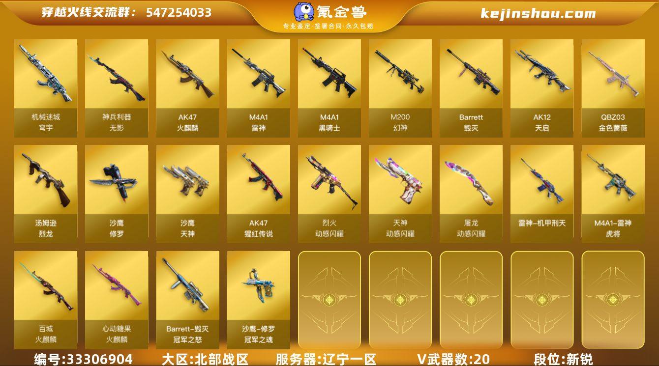 辽宁一区-22V-0王者武器数-0炫金武器数 【热门武器】:QBZ03-金色蔷薇,M200-幻神,M4A1-黑骑士,汤姆逊-烈龙,沙鹰-修罗*2 【音效卡】:AK47-火麒麟音效卡,M4A1-雷神音效卡,Barrett-毁灭音效卡,70KG语音包,绝迹语音包 【皮肤】:幻神-丹凤,雷神-虎将,雷神-冠军之魄,雷神-机甲刑天皮肤,火麒麟-百城,火麒麟-心动糖果,毁灭-冠军之怒,修罗-冠军之魂*2 【角色】:乔伊教练,暗夜审判,风暴女,虎妞,嘉年华灵狐,娟娟,龙儿,潘多拉-甜心教官,斯沃特-X,雪莉杨-摸金校尉,夜玫瑰-幻能朋克,职业选手 【人偶武器】:M4A1-雷神-精英刀锋,AWM-灵狐-15周年嘉年华,迷你裂空之翼*2,生化手雷-机甲核心,迷你艾比 【暴走生化】:黑龙吞噬者,超级对讲机 【挑战大师】:AK47-冰龙粉碎者,激光毁灭者III-白马银枪,VEPR-12-金魔,神圣爆裂者-末日III,阐释者III 【英雄级武器】:AK47-火麒麟*2,M4A1-雷神,M4A1-黑骑士,AK12-天启,无影-神兵利器,QBZ03-金色蔷薇,烈火-动感闪耀,AK-47-猩红传说,机械迷城-穹宇,Barrett-毁灭,M200-幻神,汤姆逊-烈龙,沙鹰-修罗*2,沙鹰-天神,天神-动感闪耀,屠龙-动感闪耀,手雷-动感闪耀,闪光弹-幻灵 【源级武器】:源·火麒麟,御·...