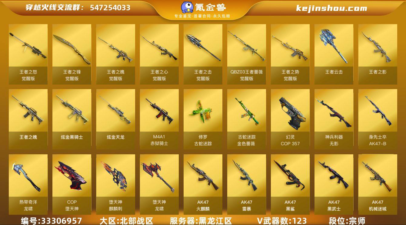 黑龙江区-129V-10王者武器数-2炫金武器数 【热门武器】:QBZ03-金色蔷薇,HK417-朱雀,M200-幻神,金色蔷薇-古蛇迷踪,修罗-古蛇迷踪,死亡之眼,荣耀世冠-雷神,荣耀世冠-柯尔特,Kar98K-星神,M4A1-黑骑士,汤姆逊-烈龙*6,RPK-盘龙*3,加特林-炼狱,斯泰尔-蝴蝶,雷神-小红,火麒麟-绝迹,USP-雷暴,COP-堕天神,COP 357-幻灵,沙鹰-修罗*3,荣耀世冠-龙啸 【王者炫金武器】:王者之影,王者之魄,王者云击,炫金骑士,炫金天龙 【音效卡】:AK47-火麒麟音效卡,M4A1-雷神音效卡,M4A1-黑骑士音效卡,Barrett-毁灭音效卡,绝迹语音包 【皮肤】:幻神-冠军之幻,幻神-AG-CFPLS17冠军,裁决-胜者为王 皮肤,雷神-暗月,雷神-荣耀之魄,M4A1-雷神-CFS 2019,雷神-虎将,雷神-耀金皮肤,火麒麟-雷神,火麒麟-冠军之心,火麒麟-心动糖果,毁灭-暗月,毁灭耀金皮肤,毁灭-星空,毁灭-英雄计划 皮肤,黑龙-能量核心,M4A1-黑龙-361,黑骑士-地狱火,黑武士-典韦皮肤,战神-粉色甜心皮肤,战神-紫绶金章皮肤,战神-流金岁月皮肤,AK47-B-常胜将军-曹操,AK47-B-常胜将军-刘备*2,AK47-B-常胜将军-孙权,AWM-天龙-传奇70KG*2,AWM-天龙-传奇白鲨,极光-能量核心,修罗-能量核心,屠...